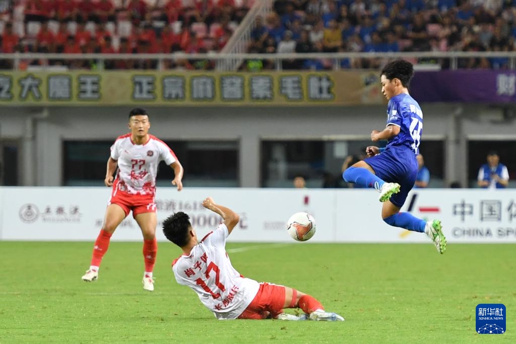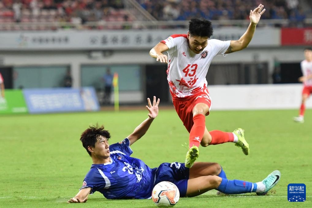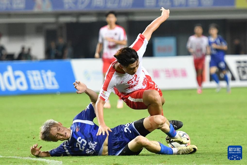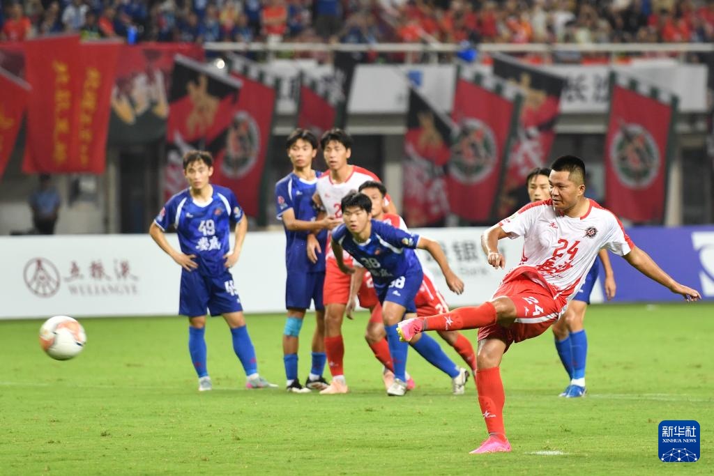 9月7日,長沙隊球員楊柯(前)在揭幕戰中主罰點球命中。