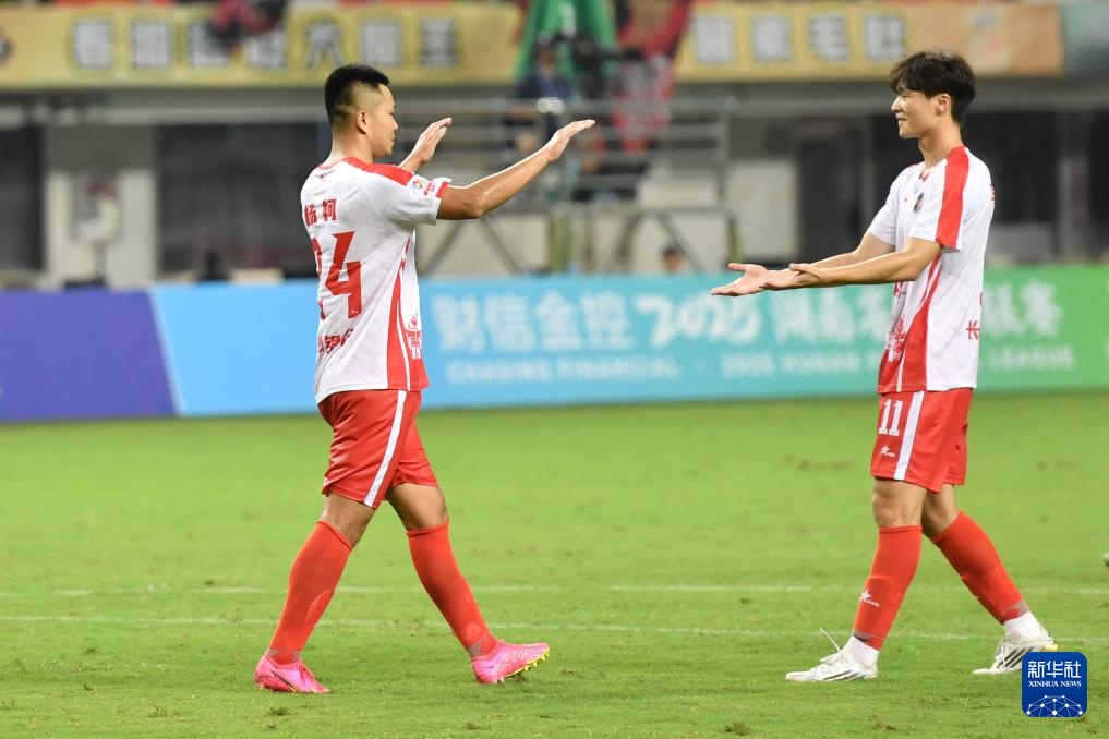 9月7日,長沙隊球員楊柯(左)在揭幕戰中進球后與隊友李章毓慶祝。