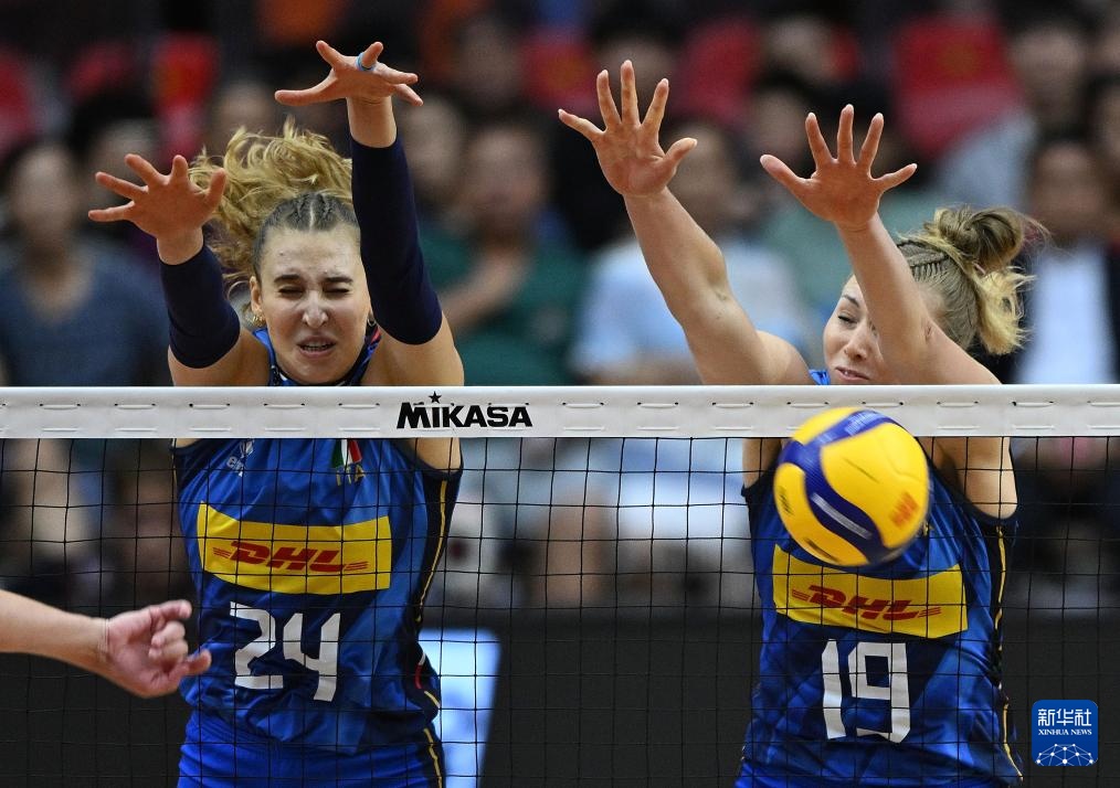 9月7日,意大利隊球員葉卡捷琳娜·安特羅波娃(左)、薩拉·路易莎·法爾在比賽中攔網。