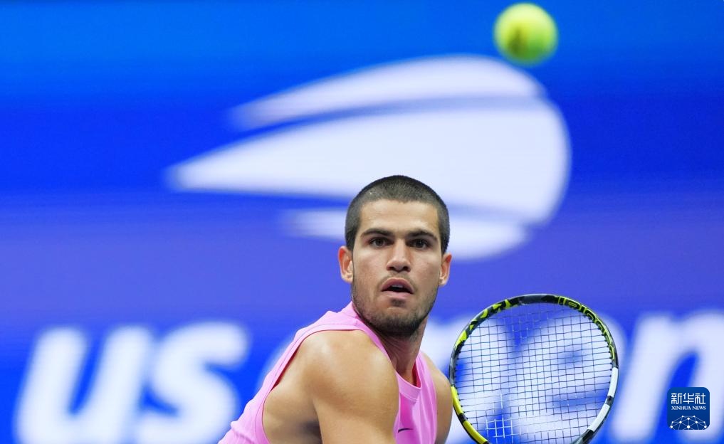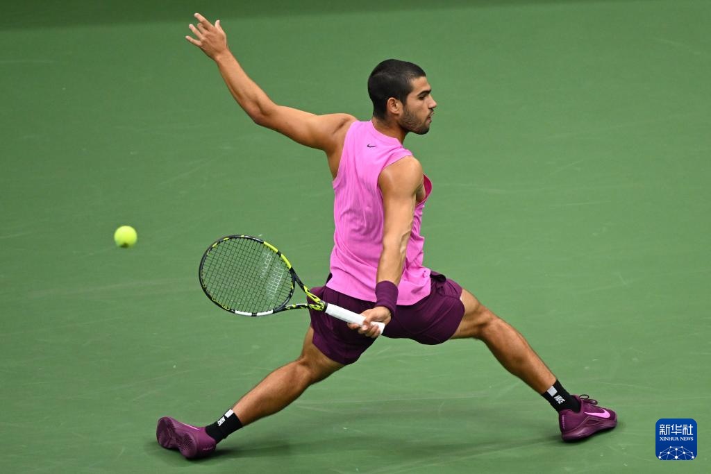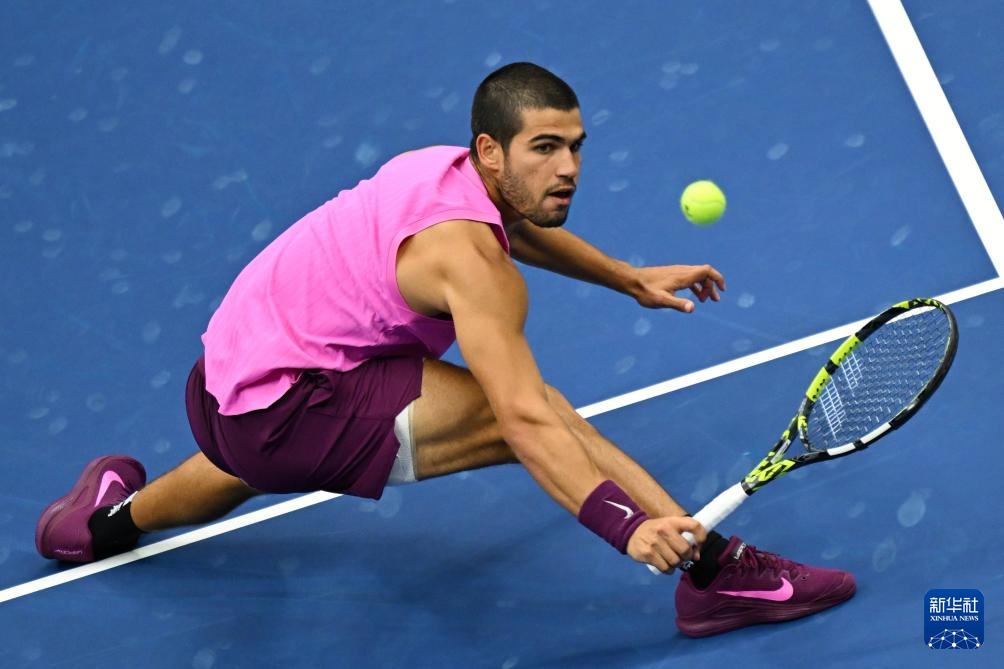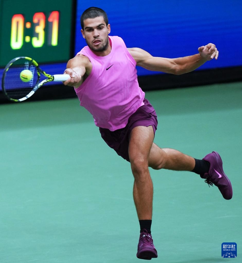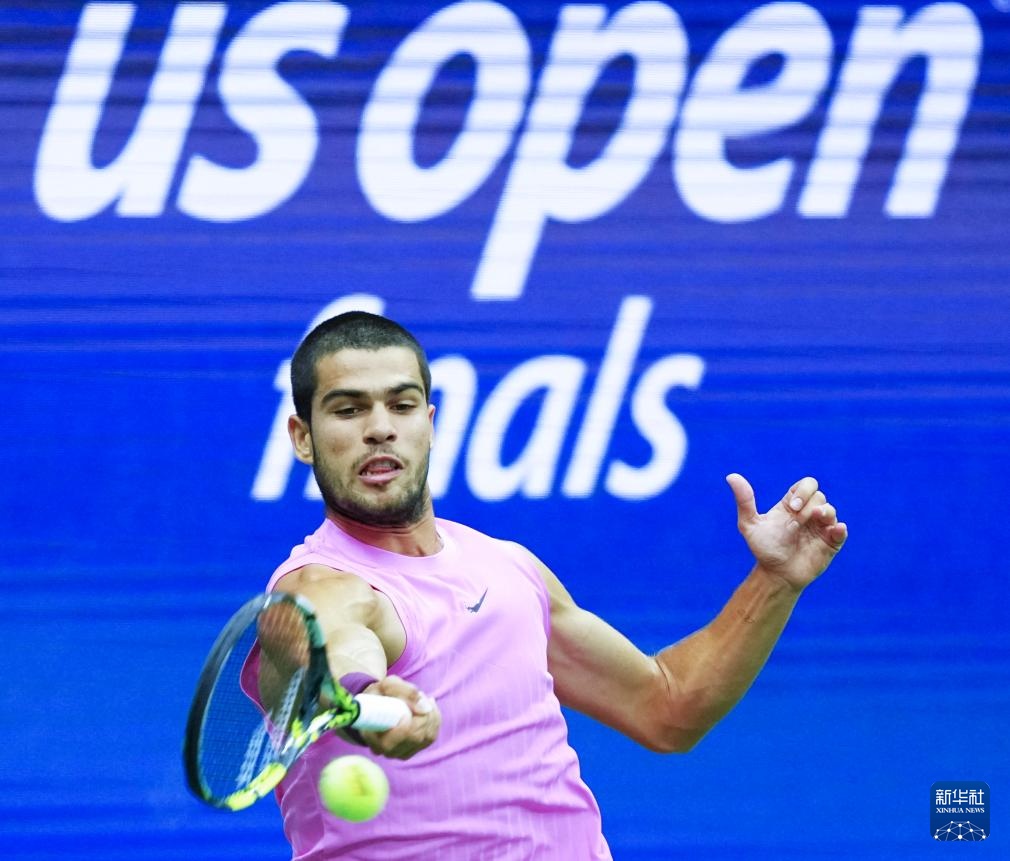 9月7日,阿爾卡拉斯(左)在比賽中發(fā)球。