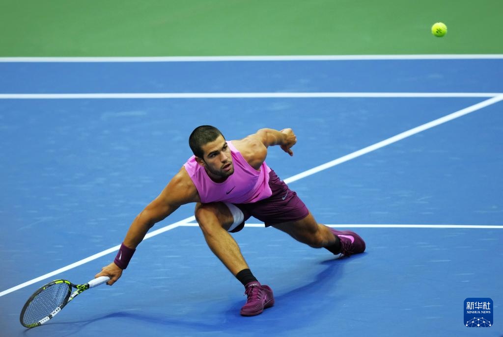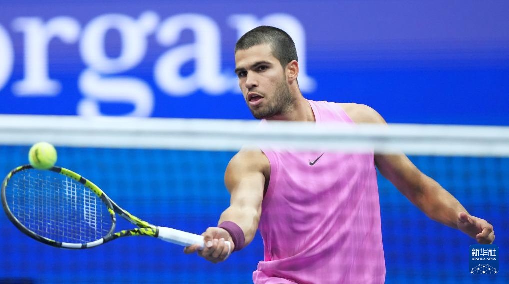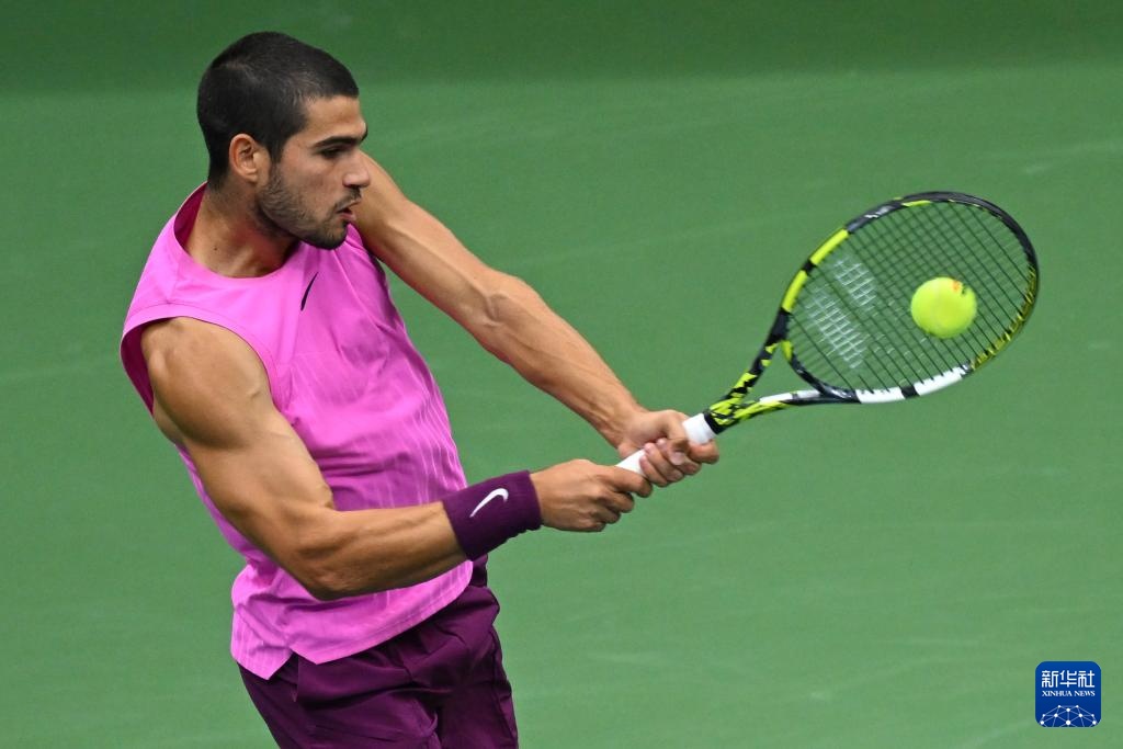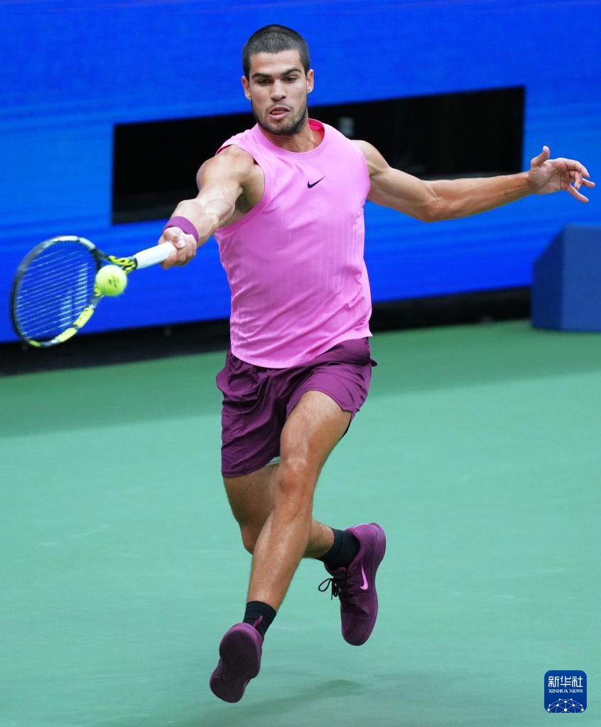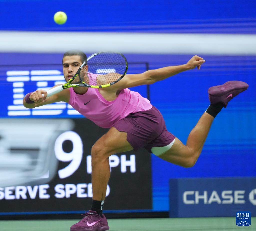 9月7日,阿爾卡拉斯(左)在比賽中發(fā)球。