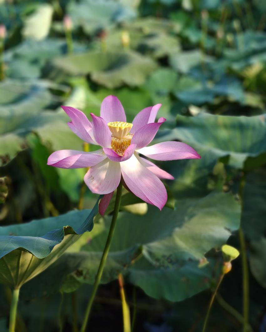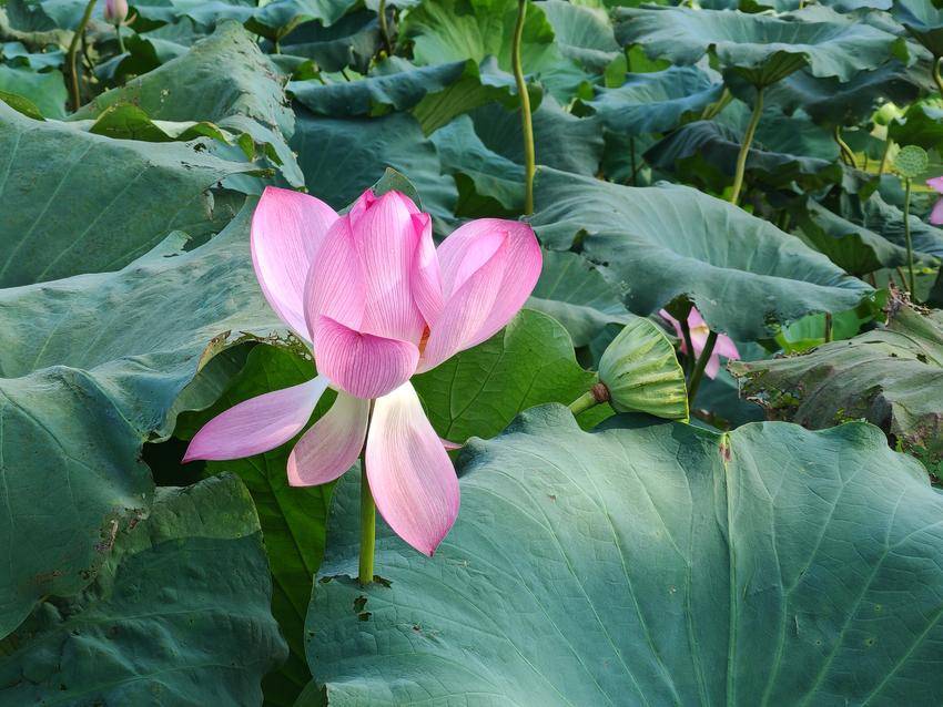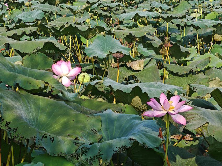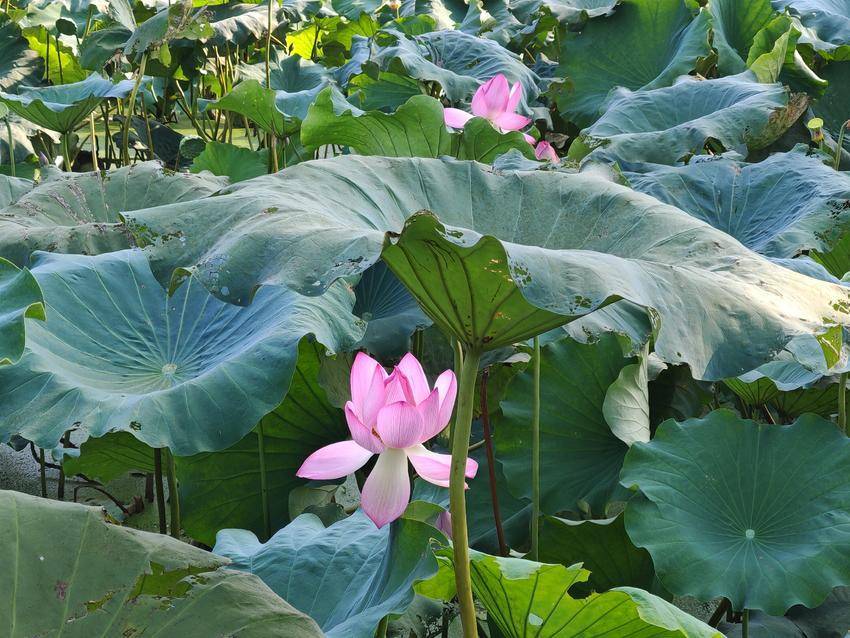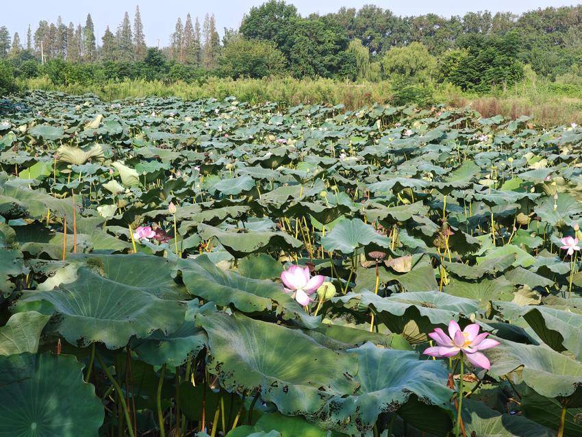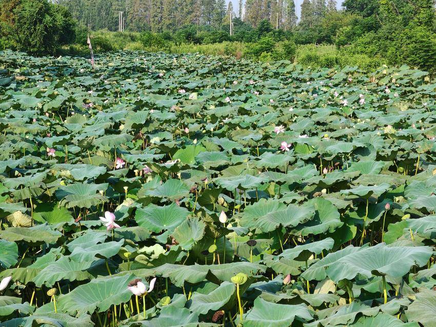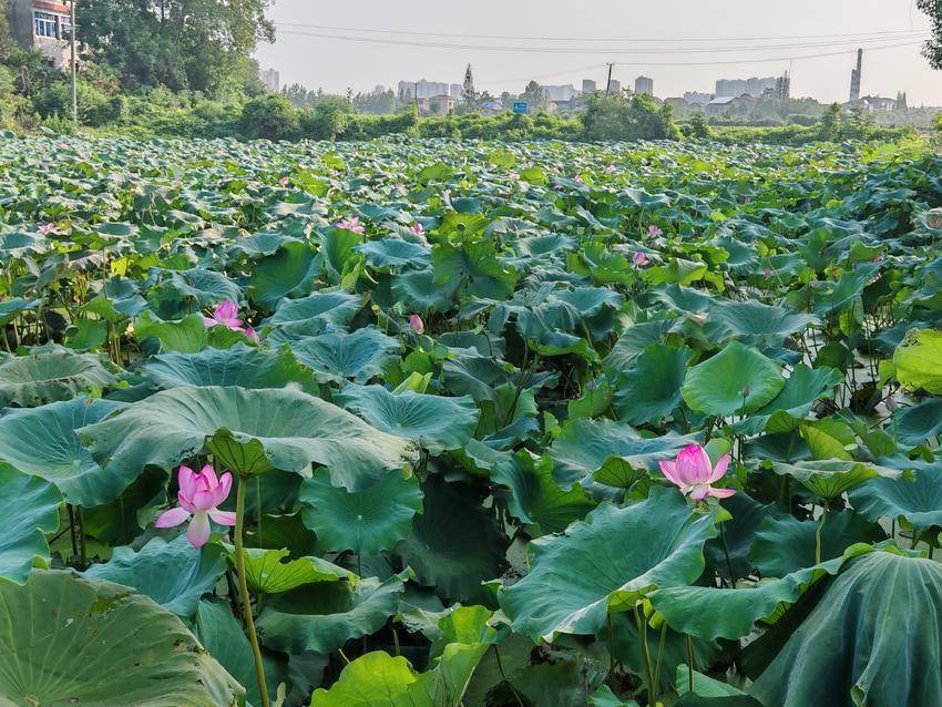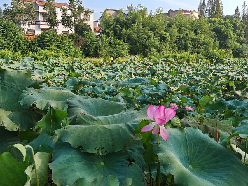 荷葉田田,青蓋層疊,似翡翠盤托起滿塘清夢。偶有蜻蜓掠過水面,倏然停駐于蓮蓬尖角,薄翼收攏時,驚起一串晶瑩的露珠墜入漣漪。遠處黛瓦白墻的村莊尚籠在淡霧中,與湛藍天幕共同構(gòu)成一幅留白適度的宋畫,而荷塘便是那抹最鮮亮的朱砂印。