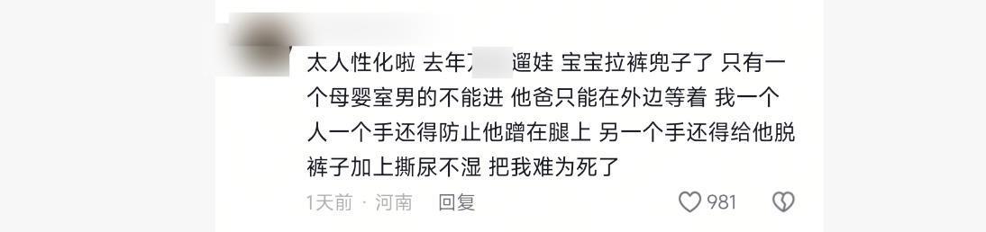 9月8日,極目新聞記者以消費者身份向新鄉胖東來(大胖)店咨詢,工作人員介紹,他們店之前就有父嬰室,只是當時叫寶寶護理室,近期作了更名。因為此前的寶寶護理室內,也有一些寶媽在里面哺乳,為避免出現尷尬,所以更名進行區分,“這讓有些單獨帶寶寶的爸爸或者老人更換尿布濕,更方便一些,母嬰室更多的是寶媽進行哺乳,父嬰室就在母嬰室旁邊。目前,新鄉地區暫時只有大胖店設置了父嬰室。”