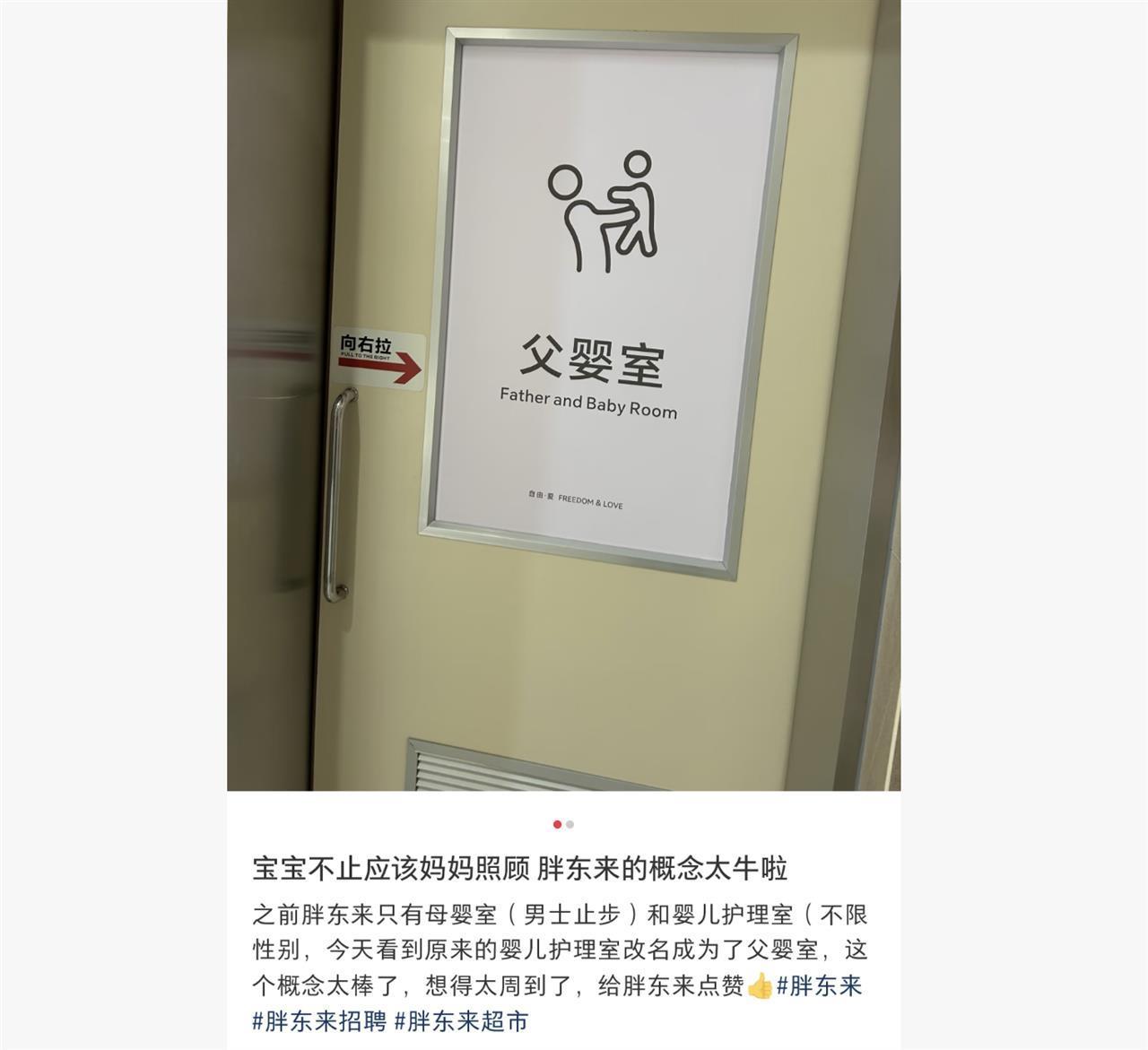 近日,有消費者在河南省新鄉市胖東來(大胖)店看到,商場內竟貼心地設置了父嬰室,她直呼“太超前”,眾多網友也為此舉點贊。有寶媽結合自身經歷稱,有的商場母嬰室不讓男士進,女性獨自照顧寶寶,有時候忙不過來,胖東來設置的父嬰室很人性化。