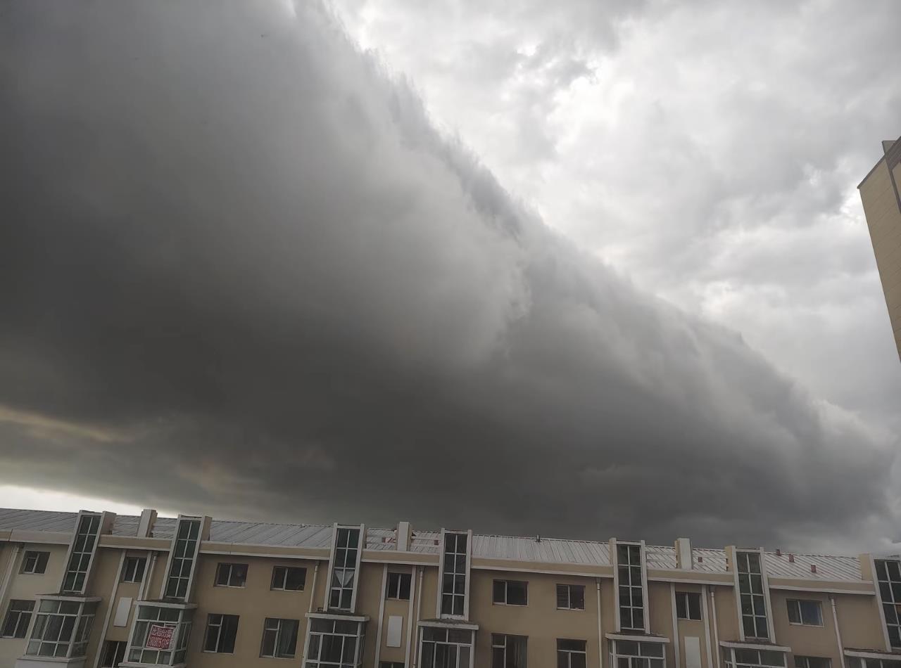 該工作人員稱,滾軸云一般是長條帶狀,橫向長度較長,但寬度較窄,昨天這條滾軸云自西向東掃過了海倫市西北部,后方黑壓壓的一片則是積雨云,“累計下雨量大約十幾毫米,不到大雨”。