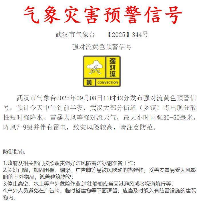 湖北日報訊(記者湯煒瑋、通訊員陳聲超)9月8日11時42分,武漢市氣象臺發布強對流黃色預警信號:預計今天中午到前半夜,武漢大部分街道(鄉鎮)將出現分散性短時強降水、雷暴大風等強對流天氣,最大小時雨強30-50毫米,陣風7-9級并伴有雷電,致災風險較高,請注意防范。