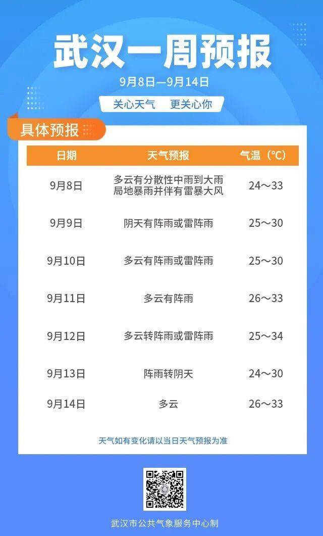 今天武漢市多云,有分散性中雨到大雨,局地暴雨并伴有雷暴大風,最低氣溫中心城區27~29℃。