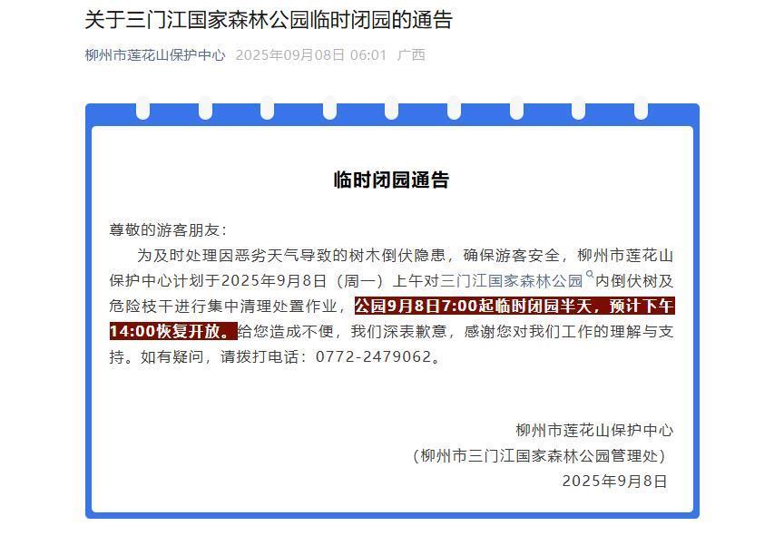 8日6時許,柳州市蓮花山保護中心(柳州市三門江國家森林公園管理處)發布臨時閉園通告稱,為及時處理因惡劣天氣導致的樹木倒伏隱患,確保游客安全,柳州市蓮花山保護中心計劃于9月8日(周一)上午對三門江國家森林公園內倒伏樹及危險枝干進行集中清理處置作業,公園9月8日7時起臨時閉園半天,預計14時恢復開放。
