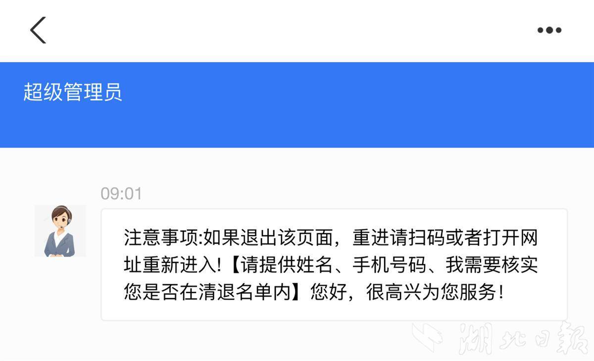 記者通過支付寶掃碼后,彈出一個“超級管理員”的客服對話頁面,對方留言稱:“請提供姓名、手機號碼,我需要核實您是否在清退名單內。”