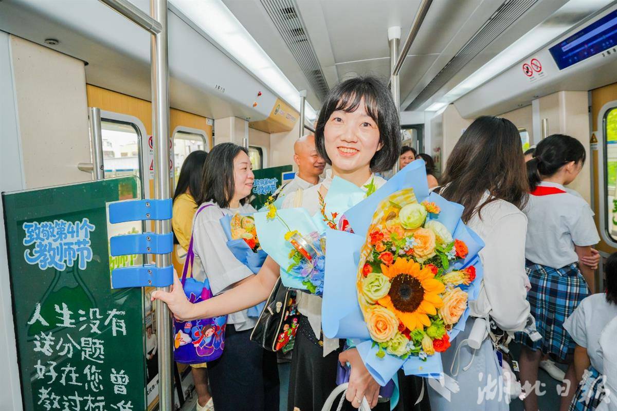全國首列“流動的課堂”教師節主題專列于同日投入運營。車廂以語文、數學、文史科學與音樂四大學科為主題進行氛圍營造,通過教師寄語、古詩詞、函數公式、歐姆定律等元素,打造沉浸式課堂體驗,向人民教師致敬。車內還展示了2025年度武漢市教育系統先進教師事跡,不少教師與自己的介紹海報合影,場面溫馨感人。一位教師感慨地說:“這是一份特別的節日禮物,更是一場充滿溫度的城市對話。”