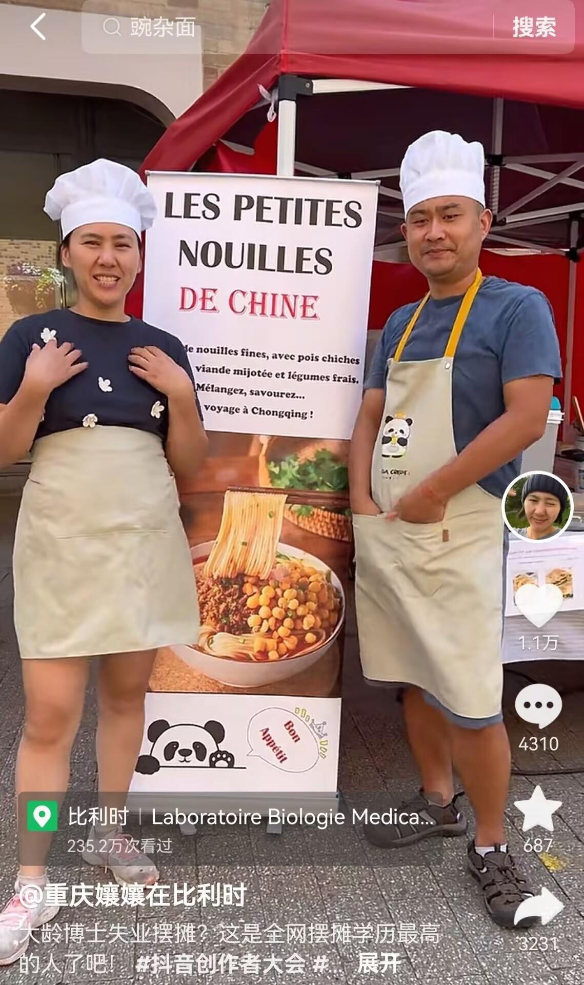 近日,重慶女子汪女士和其江蘇籍博士丈夫丁先生在比利時街頭擺攤售賣重慶豌雜面的視頻火了,夫妻二人憑借這道中國美味吸引了不少外國食客,攤位前常常排起長龍。