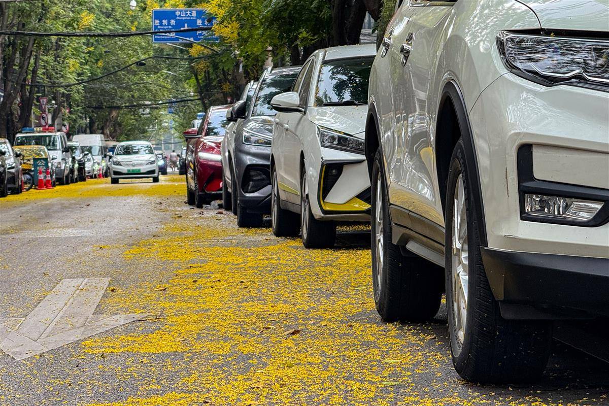 2025年9月8日,在漢口張自忠路上,突如其來的大風,令路旁欒樹搖曳生姿,金黃色的花朵紛紛揚揚灑落,鋪就一條“黃金大道”,車輛頂部也覆上碎金般的花瓣。市民市民駐足記錄這場“秋日限定”的欒樹花雨。(湖北日報全媒記者 倪娜 攝)