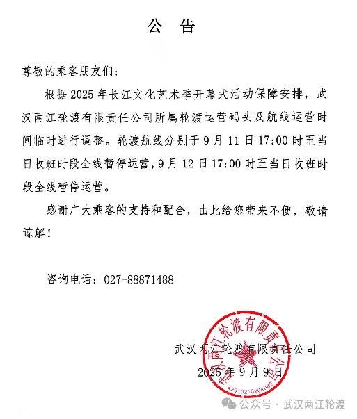 湖北日報訊(記者馮袁玥)9月9日上午,武漢兩江輪渡發布公告稱,根據2025年長江文化藝術季開幕式活動保障安排,武漢兩江輪渡有限責任公司所屬輪渡運營碼頭及航線運營時間臨時進行調整。輪渡航線分別于9月11日17:00時至當日收班時段全線暫停運營,9月12日17:00時至當日收班時段全線暫停運營。
