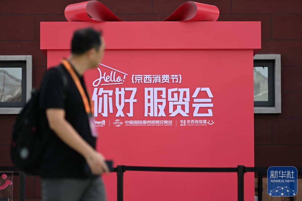 ↑ 9月9日,在首鋼園,一名男子經過寫有“你好服貿會”的裝置。
