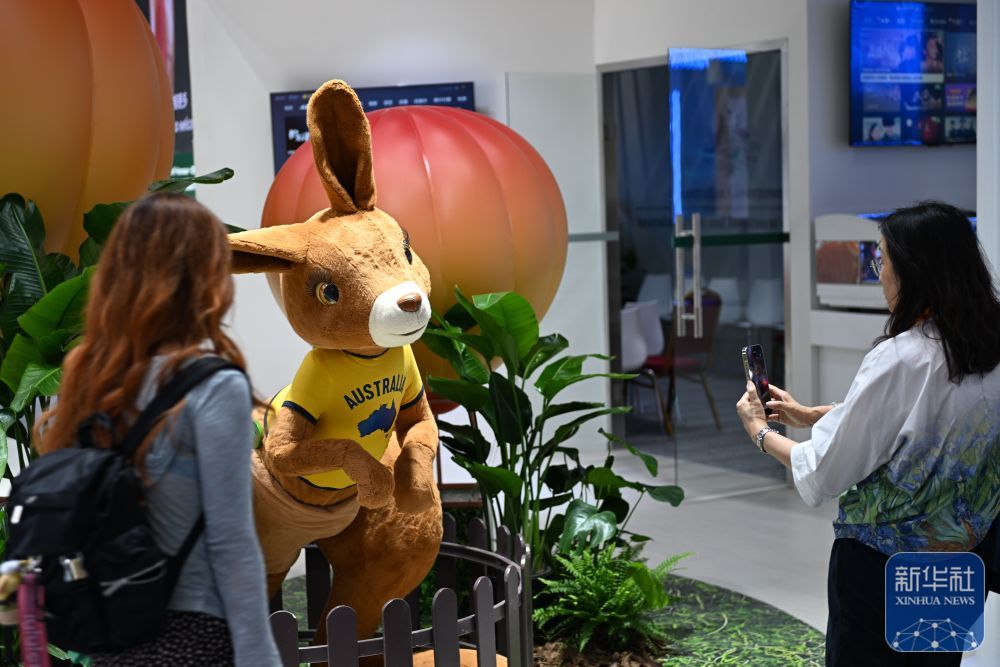 ↑ 9月9日,一名女子拍攝本屆服貿會主賓國澳大利亞展臺上的袋鼠玩偶。