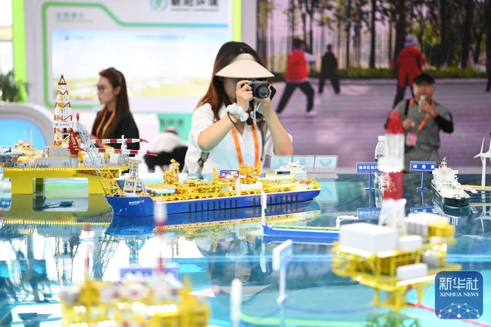 ↑ 9月9日,參觀者在服貿會展廳的中國海油展臺參觀。