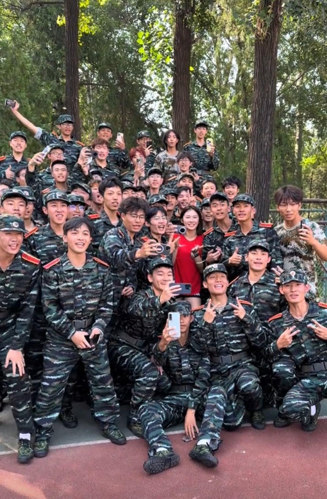 吳艷妮與軍訓新生合影留念(來源:網絡)