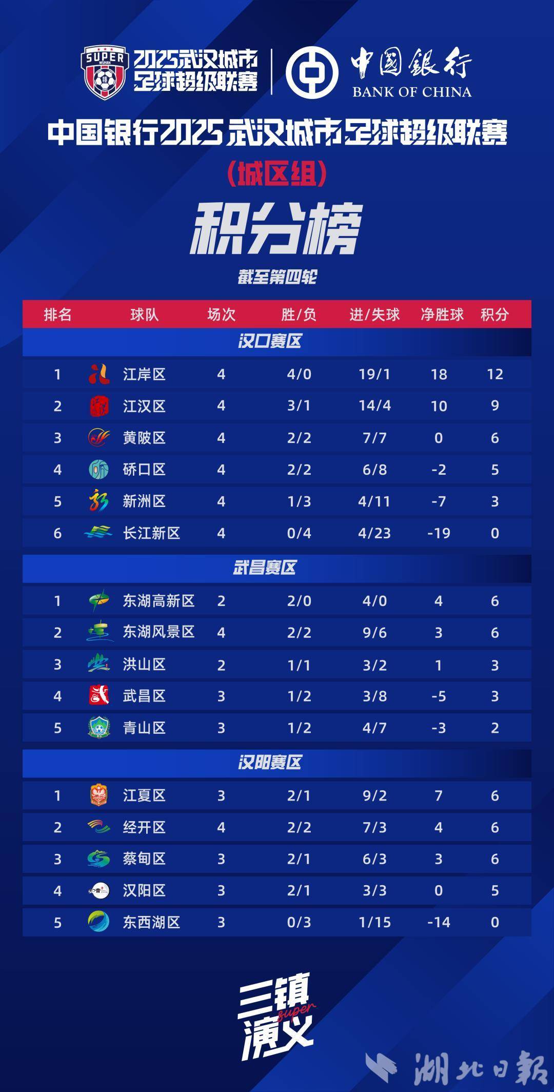 根據(jù)最新積分榜,江岸區(qū)、東湖高新區(qū)、江夏區(qū)分列各賽區(qū)第一。長江新區(qū)、青山區(qū)、東西湖區(qū)仍在各賽區(qū)墊底。