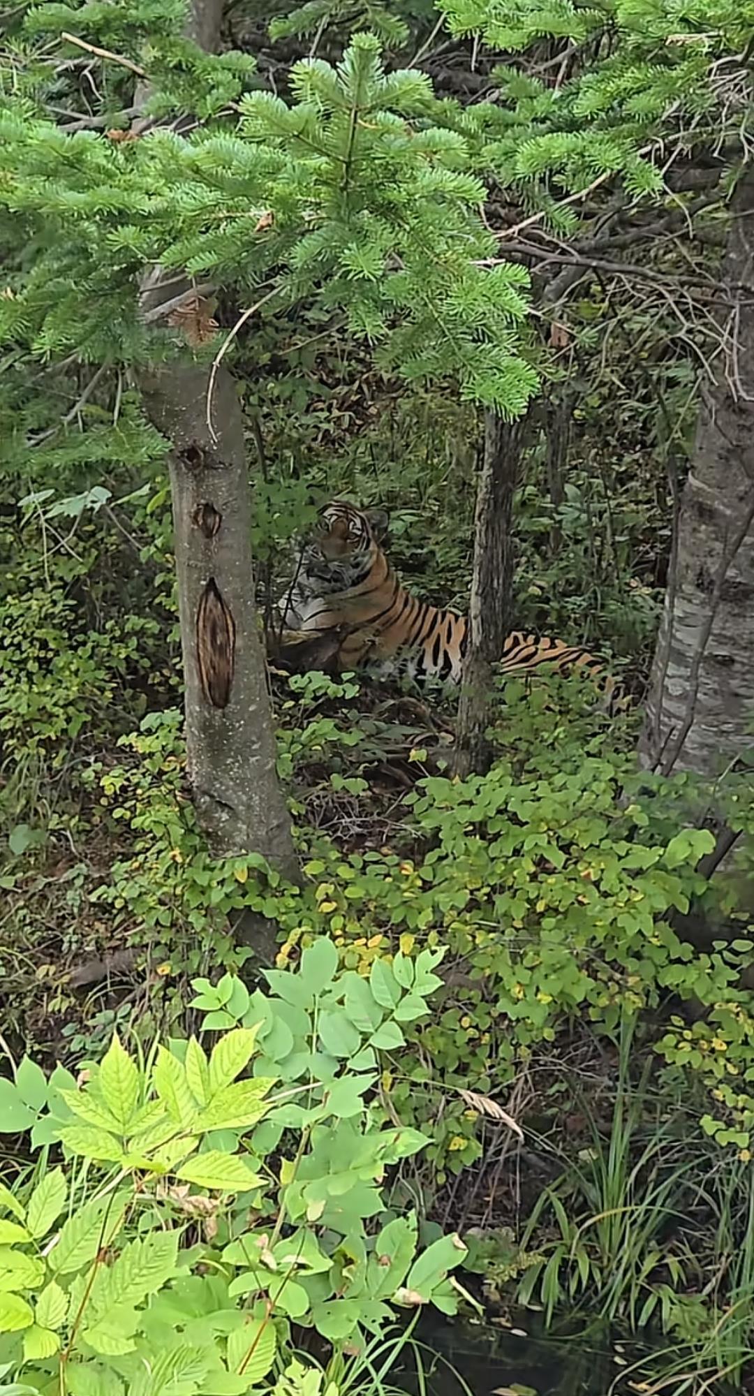 該男子拍攝的視頻顯示,叢林中出現(xiàn)一只東北虎,該老虎體型龐大,趴在地上休息。該男子看到后向其打招呼并喊話:“小貓咪,親愛的小貓咪?!彪S后,東北虎轉(zhuǎn)頭看向鏡頭“凝視”許久,其間沒有起身走動(dòng)。