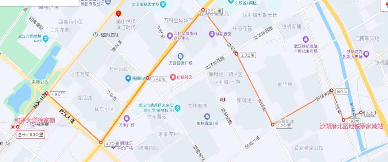 微公交16路:首末站由沙湖港北路地鐵羅家港站至和平大道徐家棚,線路走向:沙湖港北路經才匯巷、團結大道、鐵機路、友誼大道、徐東大街、和平大道,單程線長5.3公里。