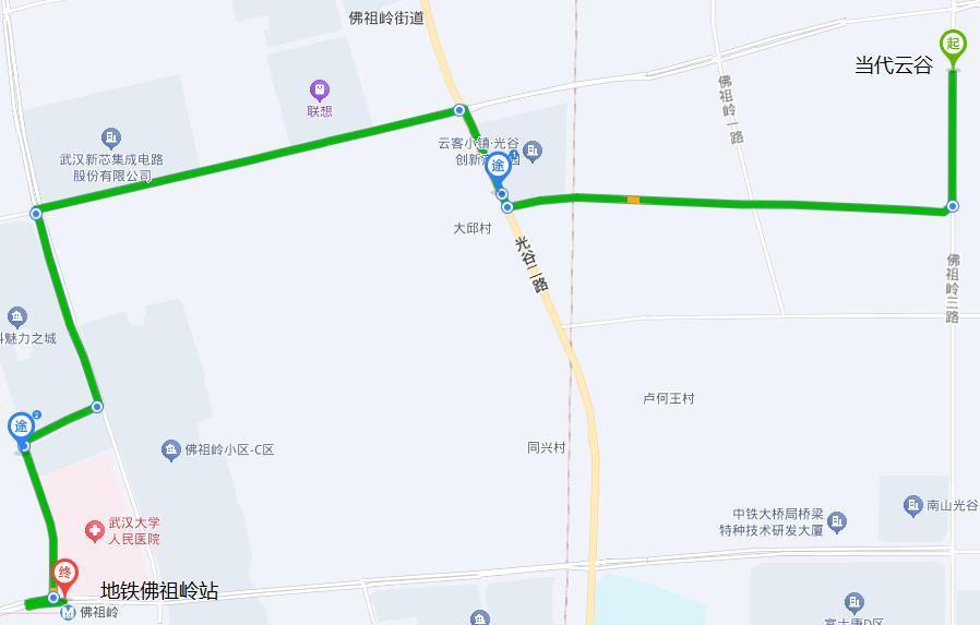微公交13路:首末站由佛祖嶺三路高新六路至高新六路佛祖嶺,線路走向:佛祖嶺三路、港邊田一路、光谷二路、中芯一路、店岑路、高新六路,單程線長5.9公里。