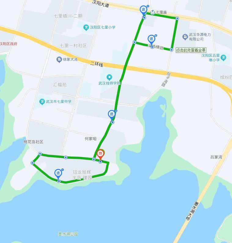 微公交9路:首末站由何家嘴路漢橋路至桃花島公交場站,線路走向:何家嘴路、漢橋路、漢陽大道、五麟路、漢橋橫路、漢橋路、桃花島路,單程線長6公里。