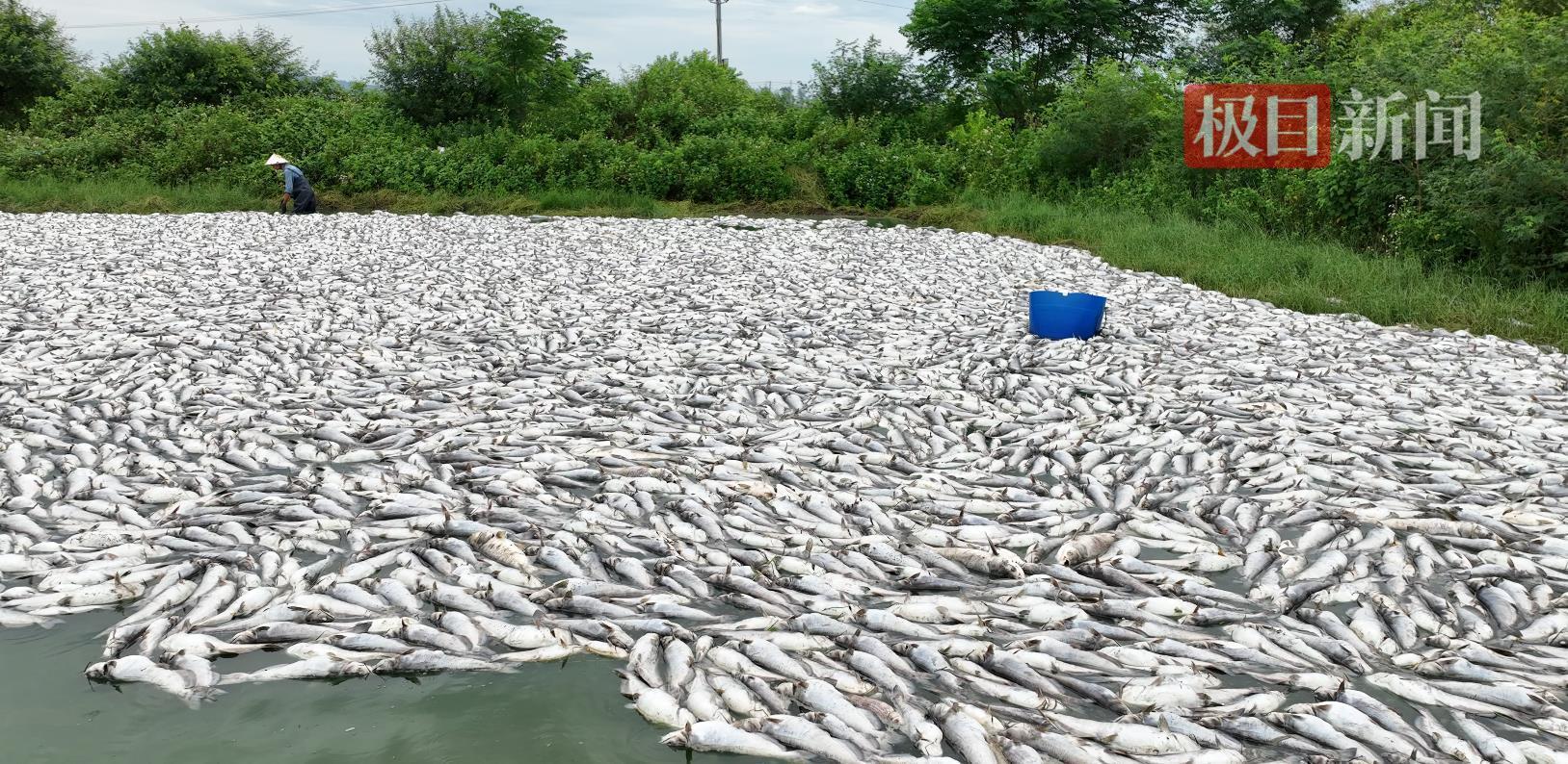 當(dāng)?shù)匾晃蝗ミ^(guò)當(dāng)事魚(yú)塘的居民向記者描述,他9日去看到多個(gè)水塘漂浮著大量死魚(yú),師傅正在打撈,“已經(jīng)有臭味了”。
