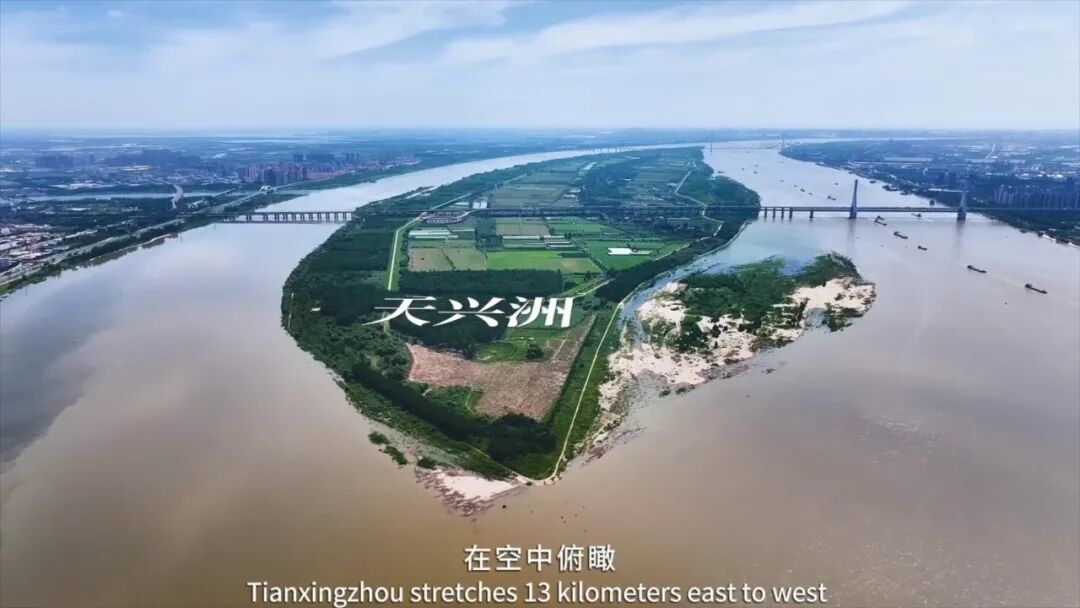 在空中俯瞰,天興洲東西綿延13公里、南北寬約2公里,位于在青山區(qū)與江岸區(qū)之間的江心。長(zhǎng)江在這里被巧妙地劈分為南、北兩股水道,它們?cè)谥揞^分流,在洲尾又匯流合一。