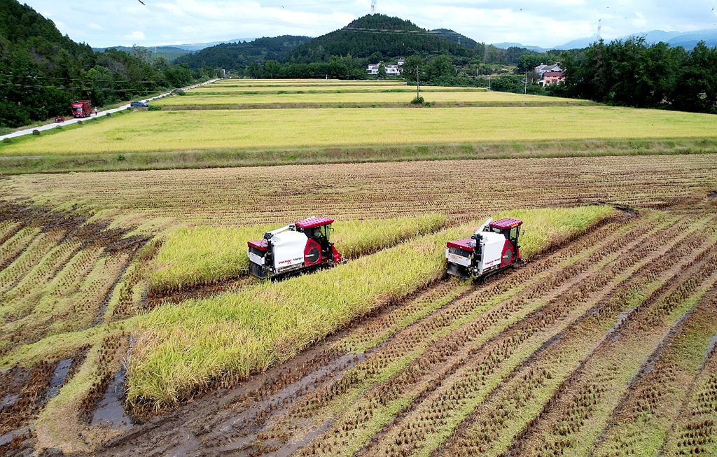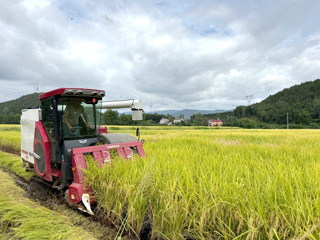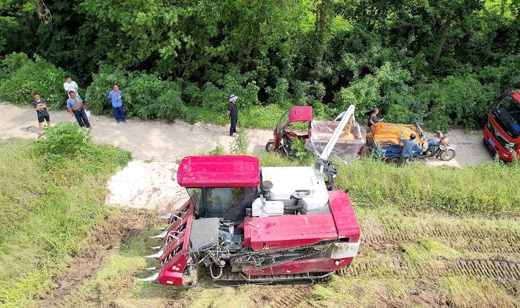 9月9日,記者來到龍泉鎮(zhèn)羅家畈村“旱改水”項目基地,金黃色的稻浪一望無際,一臺收割機穿梭其間,將顆粒飽滿的稻穗卷入倉內(nèi),收割、脫粒一氣呵成,5分鐘左右便可完成一畝稻田的收割任務(wù),大規(guī)模機械化作業(yè)為當(dāng)?shù)厮臼崭畎聪隆翱爝M(jìn)鍵”。而就在一年多前,這里還是一片荒坡,干旱缺水,坡地多平地少。