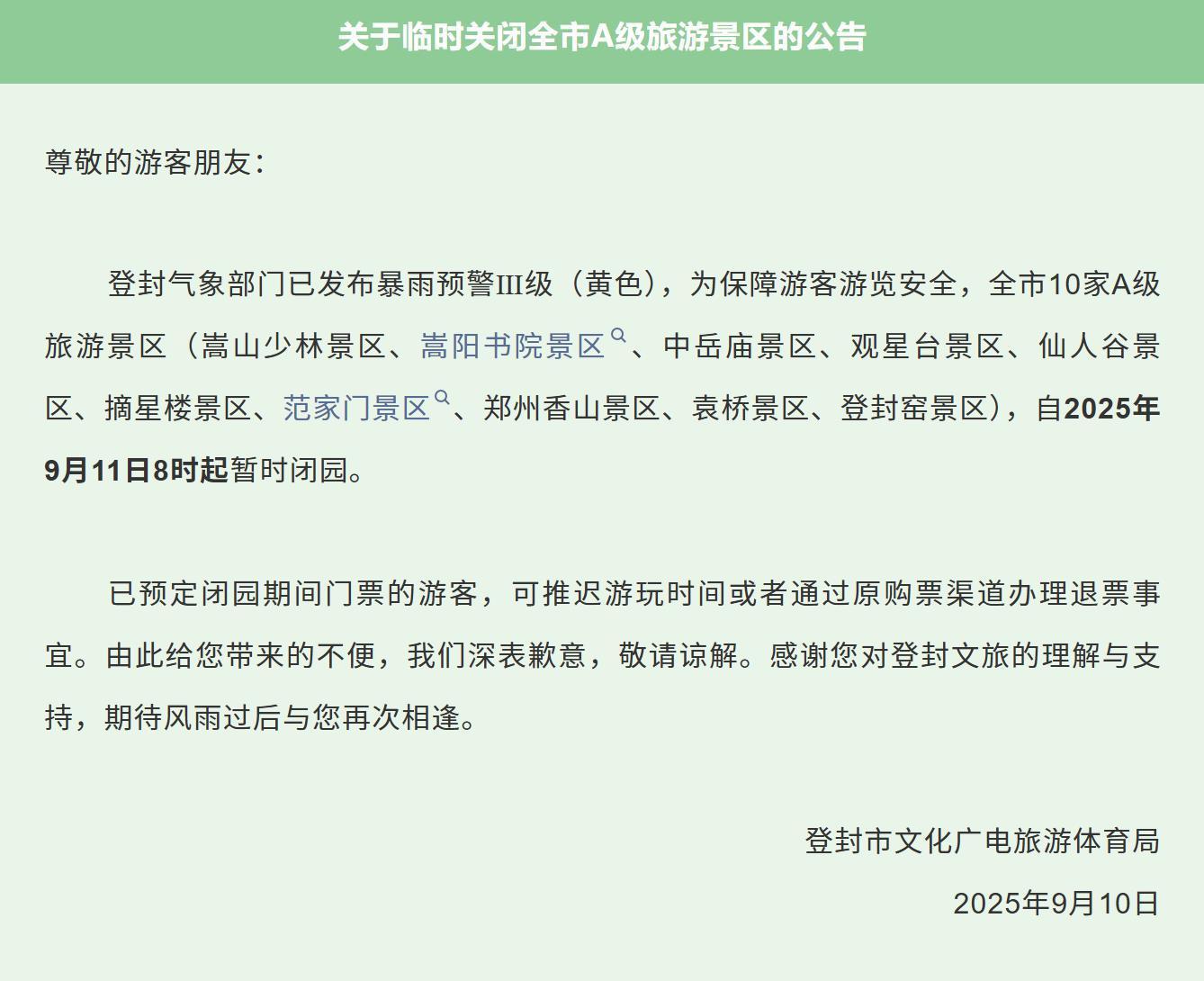 9月10日,據“登封發布”消息,受強降雨影響,全市10家A級旅游景區臨時閉園,其中包括嵩山少林景區,閉園時間自2025年9月11日8時起。