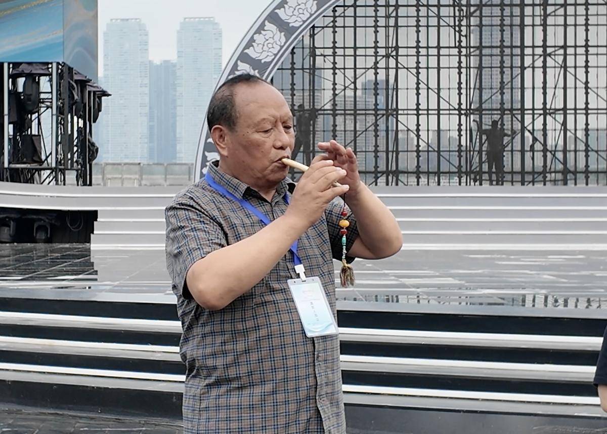 鷹笛演奏家多吉來自西藏自治區民族歌舞團,他是非遺項目藏族鷹笛藝術自治區級代表性傳承人。“這是用鷹的翅骨做的,屬于我們西藏的特色。這次我用它吹奏來自長江的源頭的曲目。”多吉向記者展示了他吹奏十多年的鷹笛,“到了內地以后,氣息更足了”多吉笑言。
