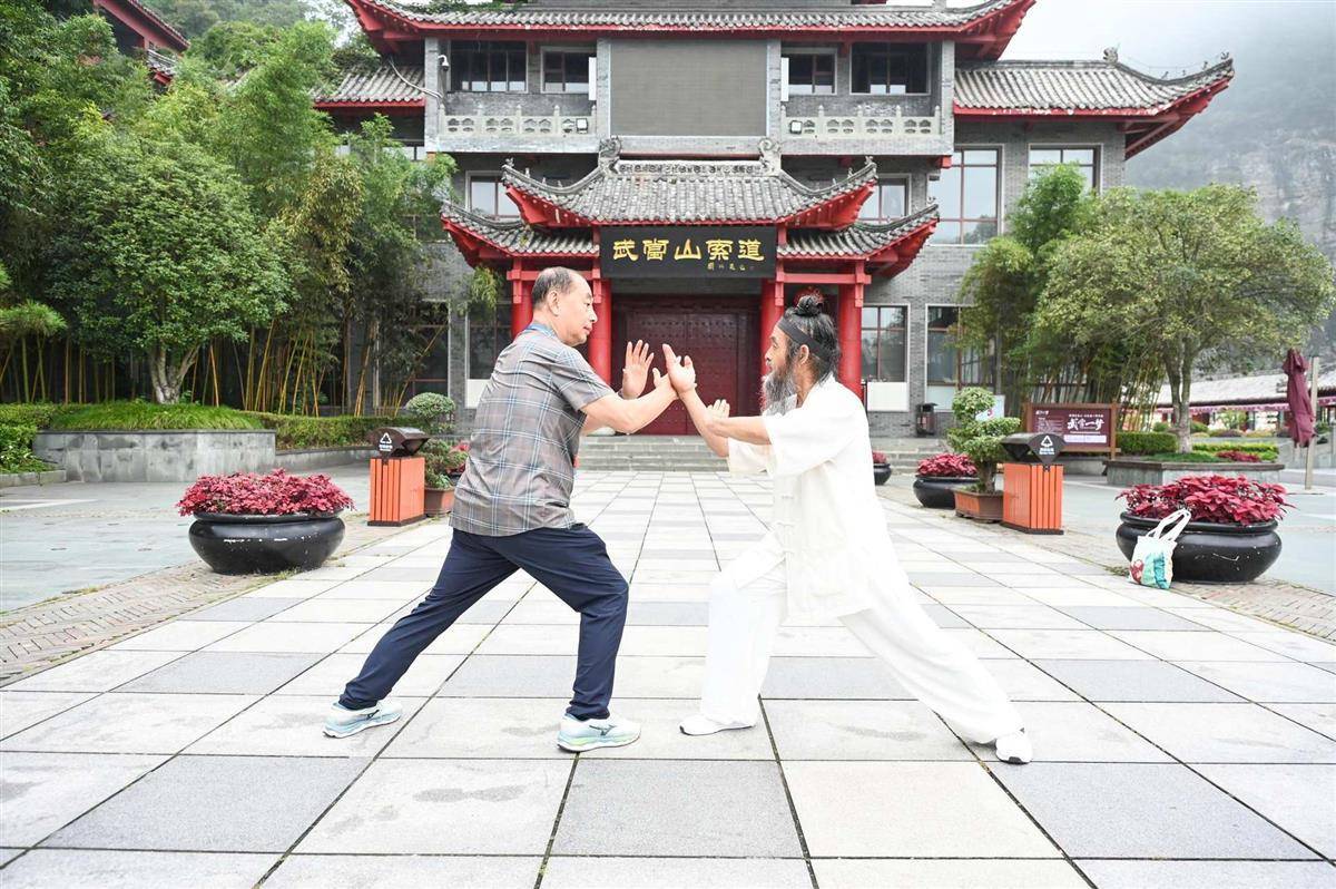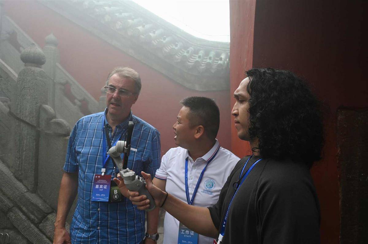 盡管天氣不作美,但仍未打消旅行商的熱情,在細雨迷蒙中朝著天柱峰頂的金頂攀登而上。在攀登的過程中,無處不在的道教文化和歷史氛圍令旅行商沉浸其中。何昂湍對道教文化感興趣,購買了一些祈福辟穢的文創產品,還向導游咨詢武當山武術學校培訓班的情況;德國旅行商達莉拉在導游的指引下進入轉運殿,在漆黑狹窄的神龕后側轉了一圈,這種感覺令她覺得新奇有趣,并表示以后有機會還要再來游玩;還有的旅行商在金頂擺出道教拱手禮的姿勢與金頂合照,有的現場習武拍照……