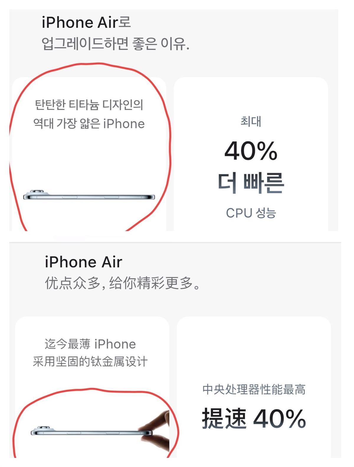 在中國、美國、日本等國家的蘋果官網上,為展示iPhone Air的輕薄,設計了捏合的手勢。然而,這一手勢在韓國的網絡文化中頗為禁忌,此前麥當勞的宣傳語就因該手勢而修改。