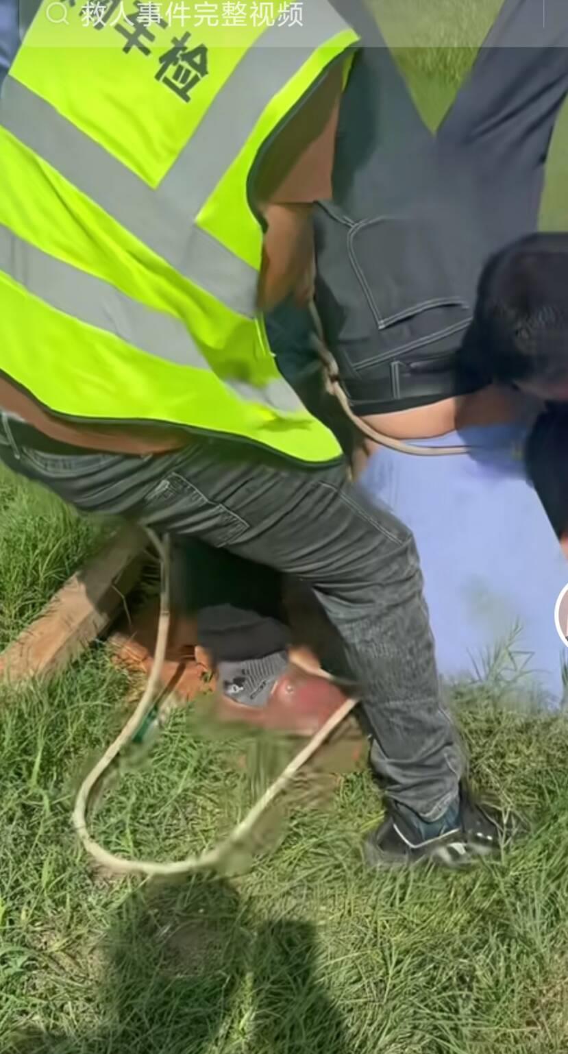 視頻顯示,機井井口不大,一名男子在井中,頭露出水面,救援的人圍在井邊。他們先放了繩子下井,讓男子抓住,好將男子拽出來,但男子并沒有抓繩子。之后,檢測站一名員工身綁繩子,頭朝下,倒掛金鐘式下井,將男子拉了出來。