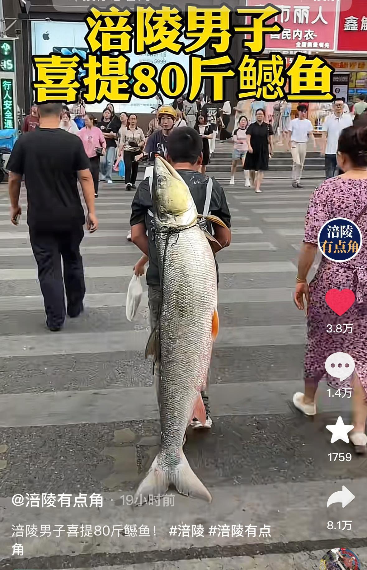 9月11日,視頻發布者告訴極目新聞記者,視頻中的主角姓羅,是他的朋友,9月10日下午釣到了這一條近80斤重的魚,隨后就到涪陵區市中心街上去“顯擺”了,“畢竟這是釣魚人的高光時刻。”