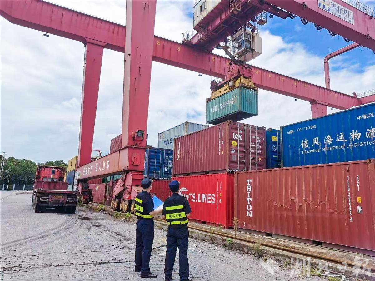 武漢海關(guān)關(guān)員在荊州鹽卡港口岸開展首艘國際直航船出口貨物查驗。