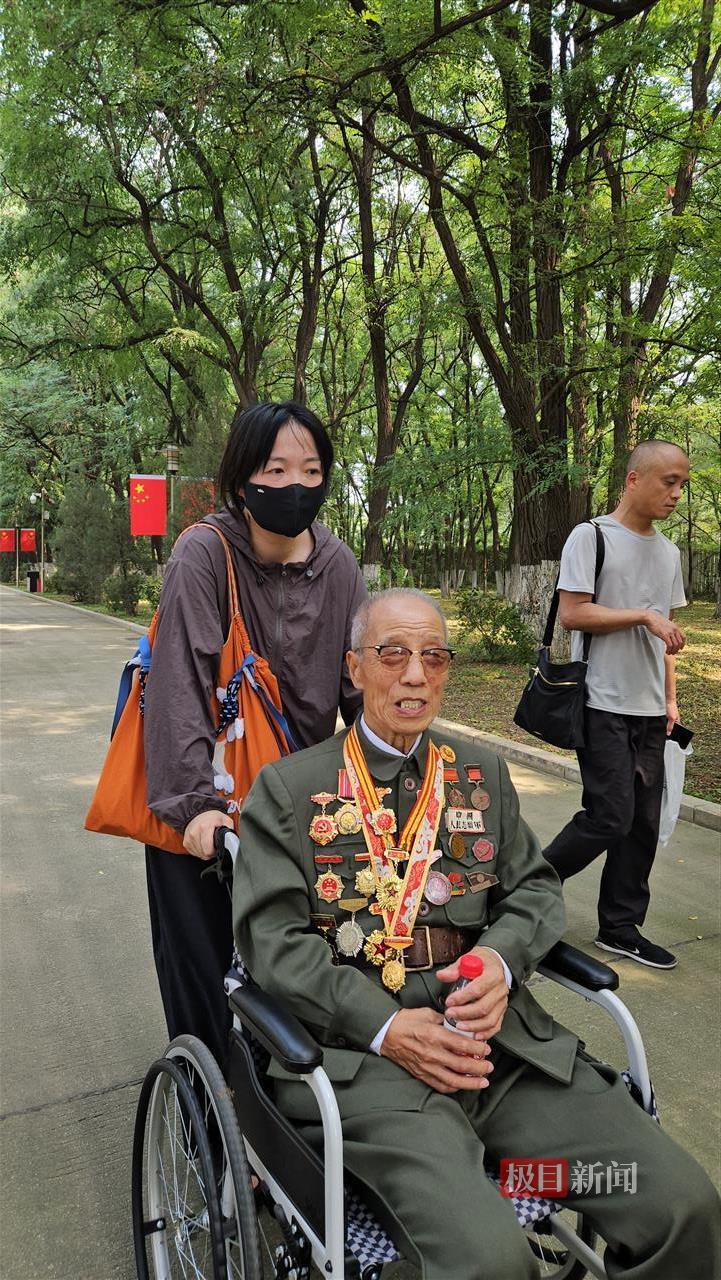 11日上午,極目新聞?dòng)浾咴诹沂苛陥@看到,一名身穿志愿軍軍服、胸前掛滿勛章的志愿軍老兵坐著輪椅在烈士陵園內(nèi)穿行。在家人的陪同下,老兵先在烈士紀(jì)念廣場(chǎng)進(jìn)行參觀,并瞻仰革命先烈。在附近為儀式做準(zhǔn)備的年輕士兵看到后,隨即立正敬禮向其致敬。
