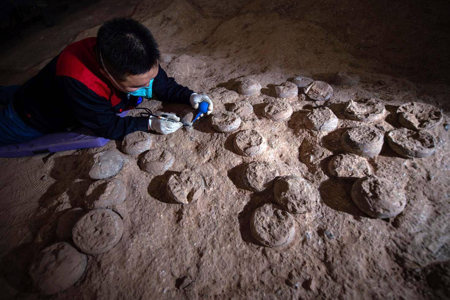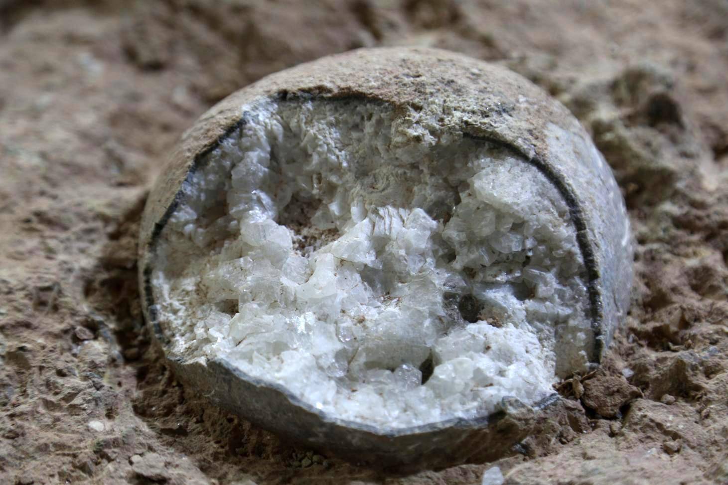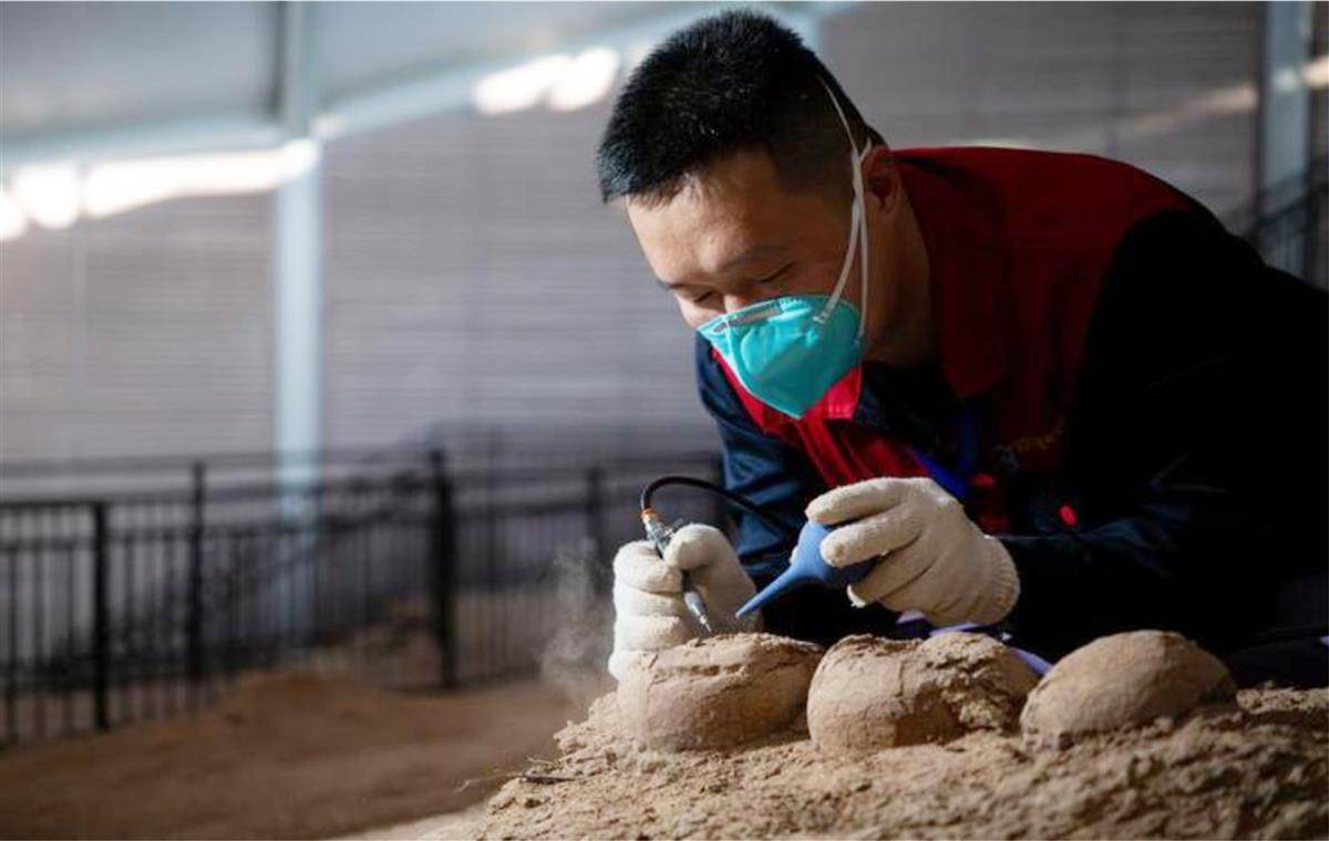 科研人員在青龍山恐龍蛋化石遺址1號館內發現填充方解石晶體的恐龍蛋化石。