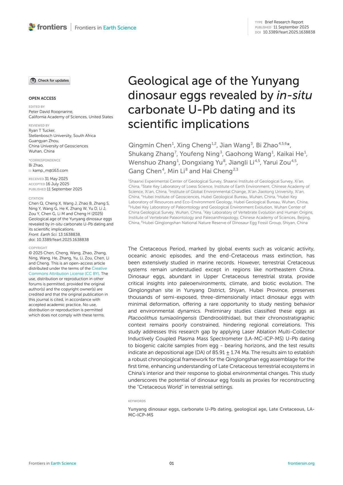 這項由中國科研團隊主導的研究,不僅填補了青龍山恐龍蛋化石年代學研究的空白,更在古生物測年技術領域發出了“中國聲音”。正如論文出版方Frontiers Press同步配發的科學新聞所述:科學家首次采用新型“化石原子鐘”測定法對埋藏于巖層中數百萬年的恐龍蛋進行精確斷代,為研究恐龍種群分布及遠古氣候環境提供了關鍵科學依據。