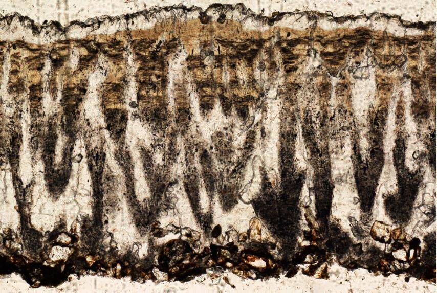 青龍山恐龍蛋化石蛋殼徑切面圖。