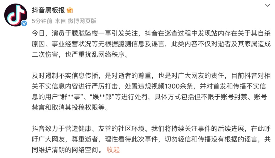 11日晚,@抖音黑板報 發文:“今日,演員于朦朧墜樓一事引發關注,抖音在巡查過程中發現站內存在關于其自殺原因、事業經營狀況等無根據臆測信息及謠言,此類內容不僅對逝者及其家屬造成二次傷害,也嚴重擾亂網絡秩序。及時遏制不實信息傳播,是對逝者的尊重,也是對廣大網友的責任,目前抖音對相關不實信息內容進行嚴厲打擊,處置違規視頻1300余條,并對首發和傳播不實信息的用戶“群**事”、“娛**郎”等進行處罰,具體方式包括但不限于賬號封禁、賬號禁言和取消其投稿權限等。