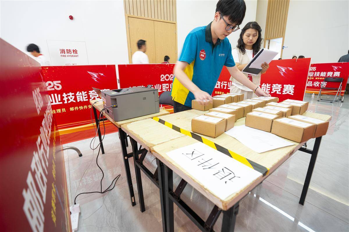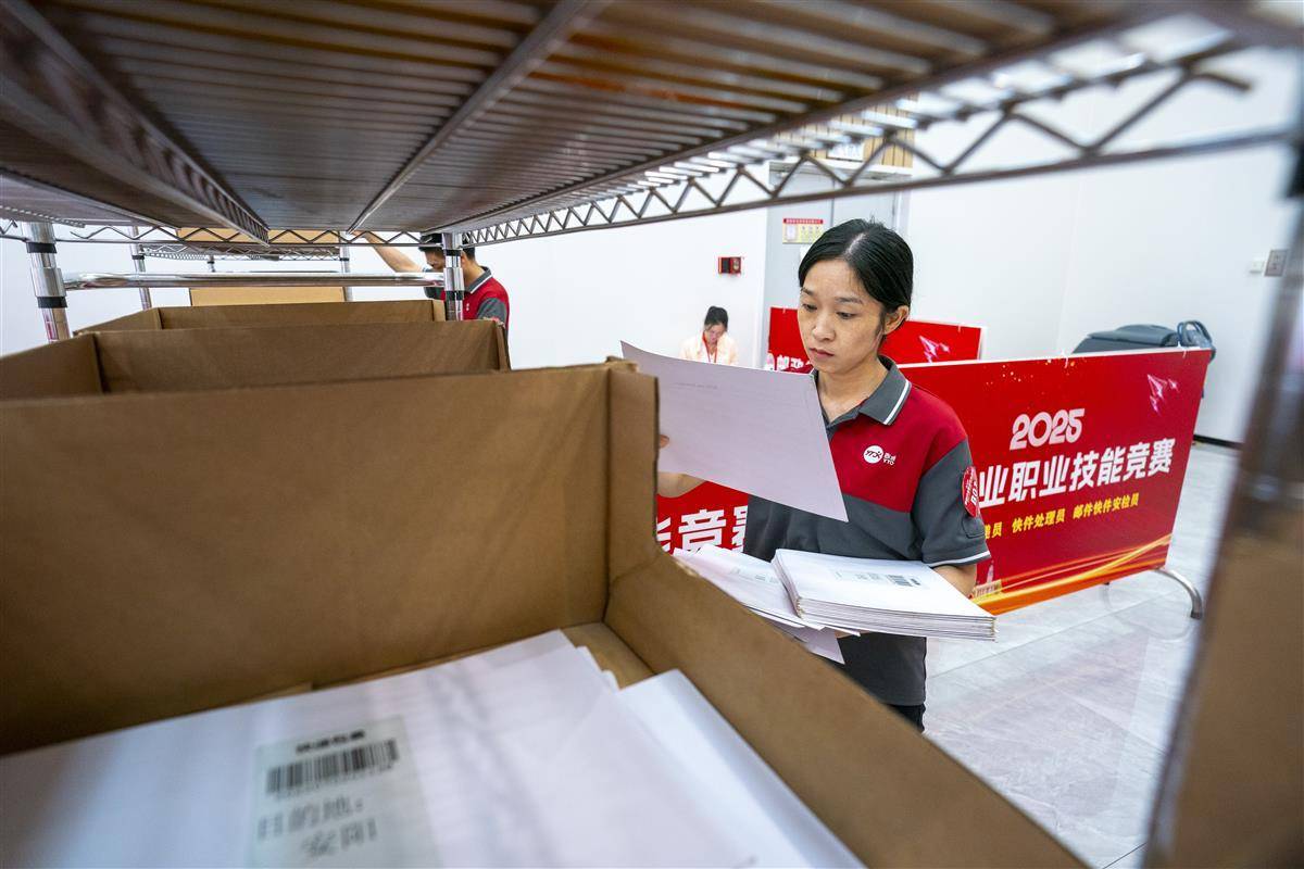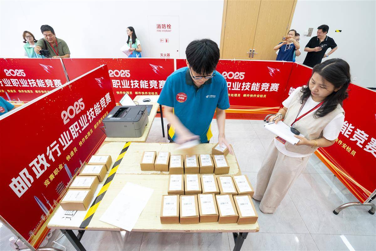 9月11日,武漢市2025年郵政快遞行業職業技能競賽在武漢商學院大學生活動中心舉行。來自9個主要品牌快遞企業的100余名一線從業者同場較量,比拼專業技能。本次技能大賽設置了快遞員、分揀員、郵件快件安檢員三個競賽職業,其中郵件快件安檢員為首次設置的競賽工種。賽場上,身穿紅、綠、藍等各色工作服的快遞員們進行派送路線設計及實施、多物品收寄、安檢判圖、可疑件現場處置、進(出)港作業、問題件處理等多個實戰項目比拼,全面檢驗了參賽選手的業務能力和專業素養。(湖北日報全媒記者 魏錸 通訊員 何妍 胡映藍 攝)