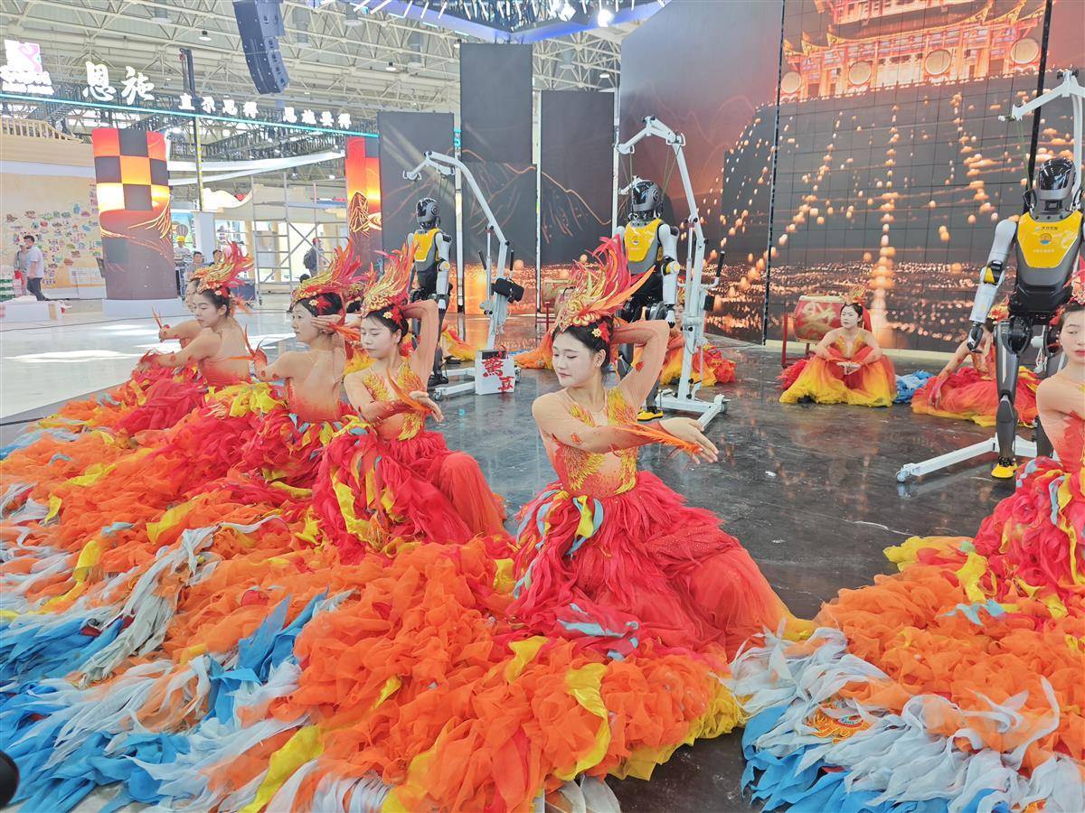 家門口的湖北館和武漢館則用科技感把荊楚特色玩出花樣,知音湖北館以6米高云夢睡虎地秦簡造型LED屏打造視覺核心,結合聲光電技術展現荊楚文明。在武漢展區,工作人員正為開幕做最后調試,春晚同款舞蹈《鳳舞九天》正在緊張彩排:數名演員身著華美服飾翩躚起舞,一旁的機器人伴隨音樂節拍精準擺動機械臂,周身LED燈帶流光溢彩,再現了春晚武漢分會場的科技藝術盛宴。