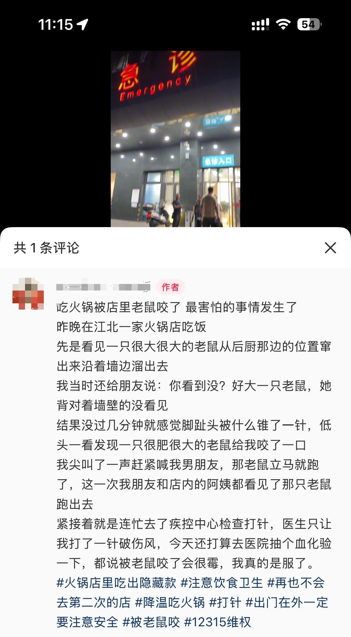 這名網(wǎng)友在帖文中稱,她在江北一家火鍋店就餐,看到一只老鼠在墻邊行走。幾分鐘后,感覺腳趾像被針扎了,低頭看發(fā)現(xiàn)是一只老鼠咬了她,隨后趕到疾控中心檢查并打了破傷風(fēng)。