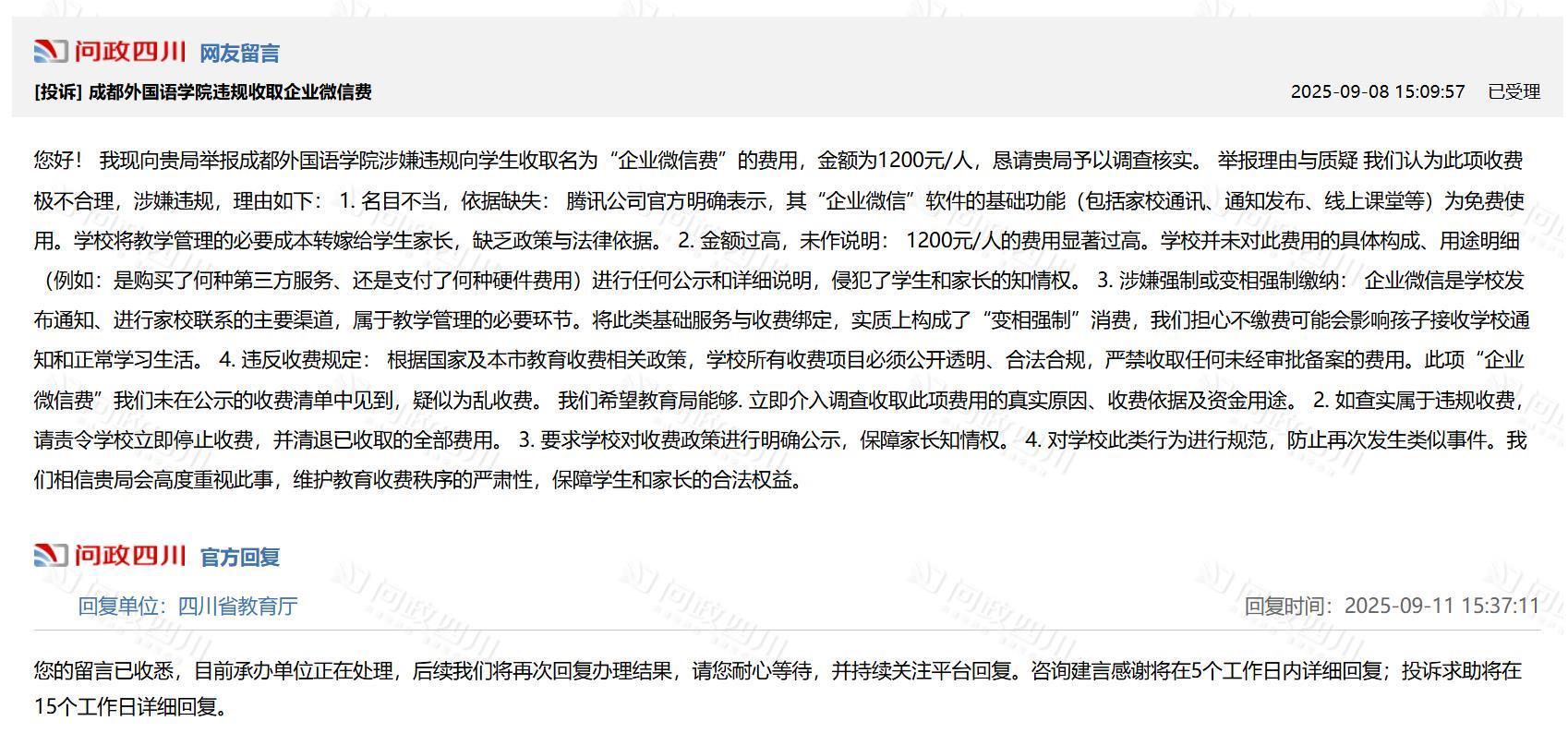 9月8日,有網友在“問政四川”投訴稱,四川成都外國語學院違規收取企業微信費。