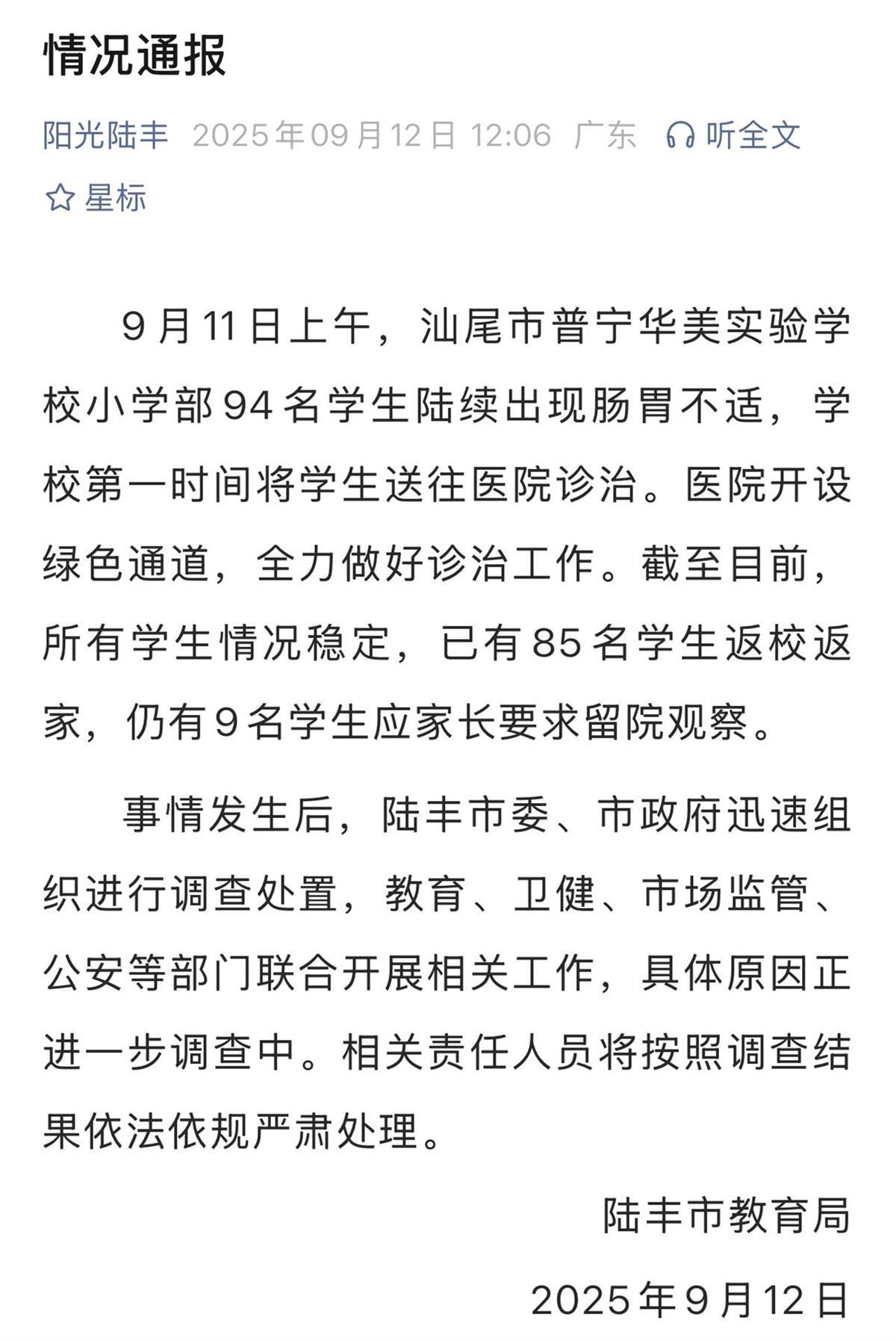 陸豐市教育局隨后發布情況通報稱,9月11日上午,汕尾市普寧華美實驗學校小學部94名學生陸續出現腸胃不適,學校第一時間將學生送往醫院診治。醫院開設綠色通道,全力做好診治工作。截至目前,所有學生情況穩定,已有85名學生返校返家,仍有9名學生應家長要求留院觀察。事情發生后,陸豐市委、市政府迅速組織進行調查處置,教育、衛健、市場監管、公安等部門聯合開展相關工作,具體原因正進一步調查中。相關責任人員將按照調查結果依法依規嚴肅處理。