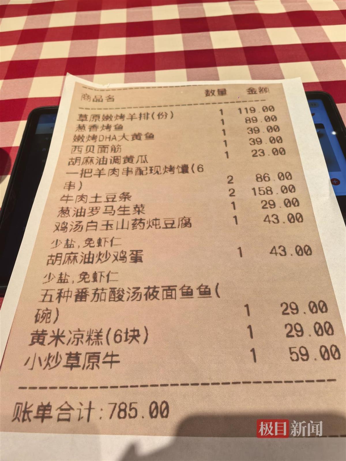 西貝的工作人員拿來菜單,極目新聞?dòng)浾咦⒁獾剑瞬藛闻c網(wǎng)上流傳的羅永浩菜單種類一樣,都是13種,但有兩種的數(shù)量和價(jià)格不一樣。其中,網(wǎng)上流傳的牛肉土豆條的價(jià)格為79元,門店提供的同款菜單價(jià)格為158元;網(wǎng)上流傳的一把羊肉串配現(xiàn)烤馕的數(shù)量為1,價(jià)格為43元,門店提供的同款菜單數(shù)量為2,價(jià)格為86元。門店提供的羅永浩同款菜單賬單合計(jì)為785元。