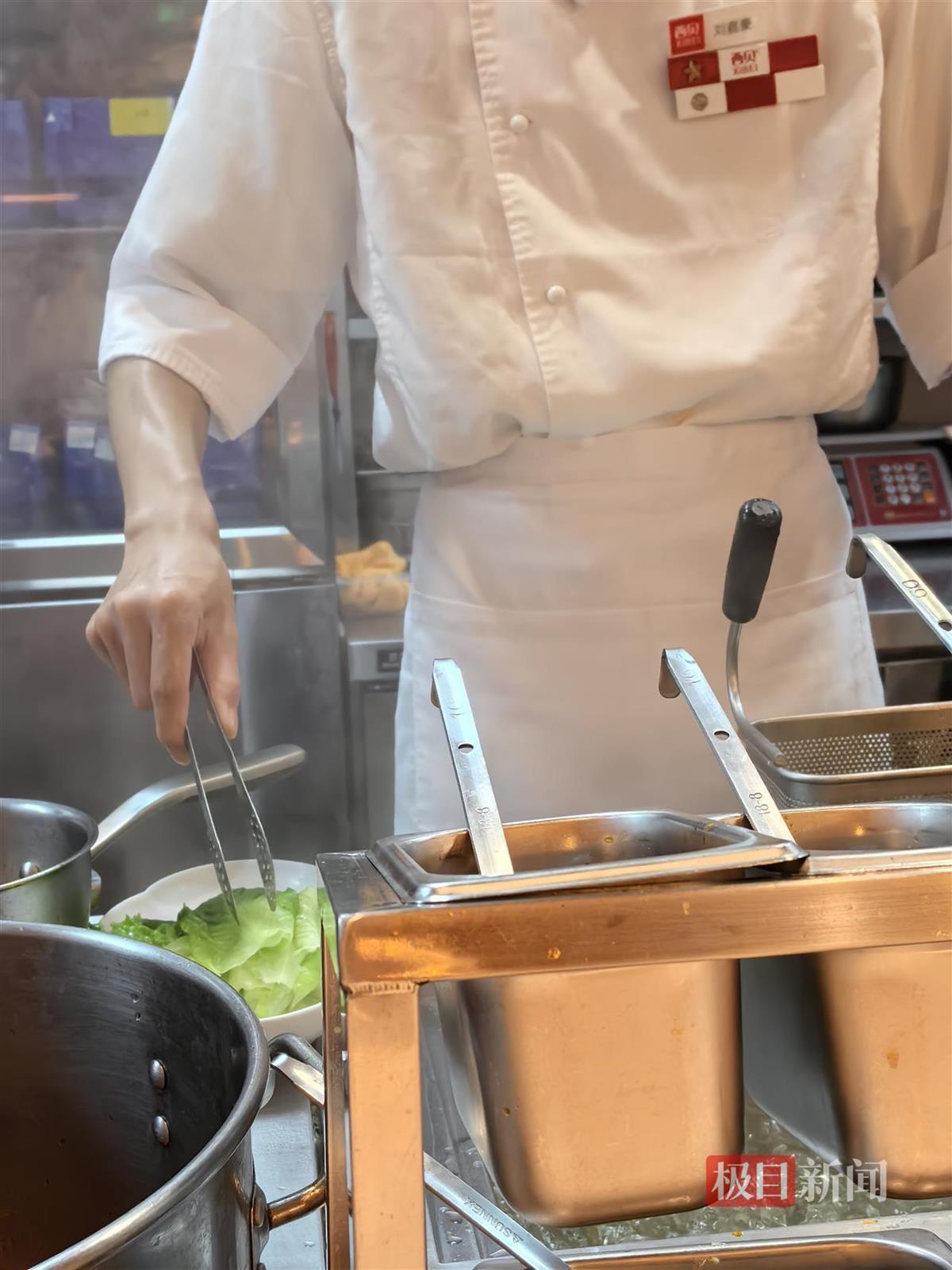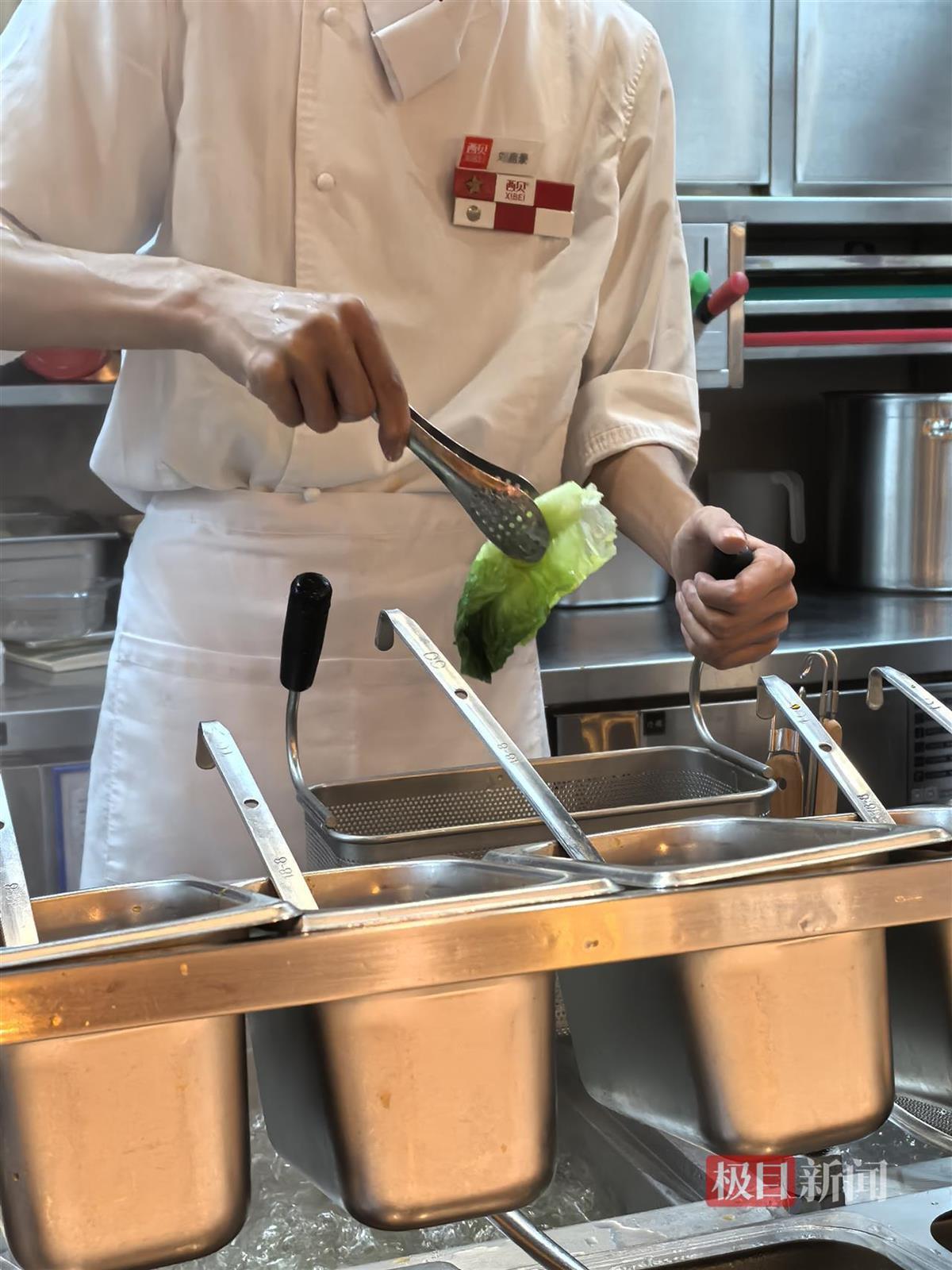 在制作蔥油羅馬生菜的區域,極目新聞記者看到,身穿白色工作服的男子拿出一袋生菜,放進不銹鋼簍子里,然后在開水中燙了燙,用筷子夾起放入盤中,澆上調料,然后端上桌。