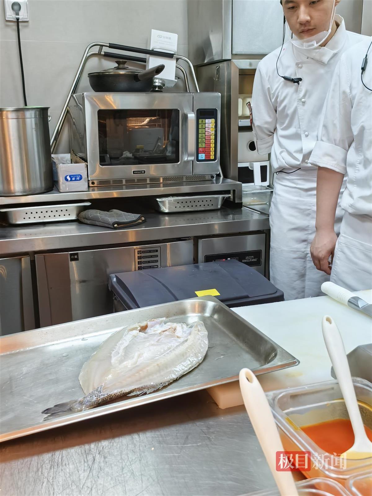 在烤魚制作區,一名身穿白色工作服的男子從儲物柜中拿出一條早已宰殺好的魚,放進盤子里,放上調料,然后放進烤箱里烤制。