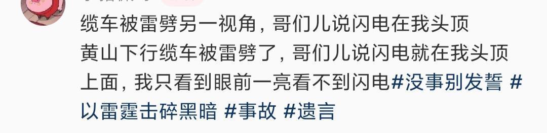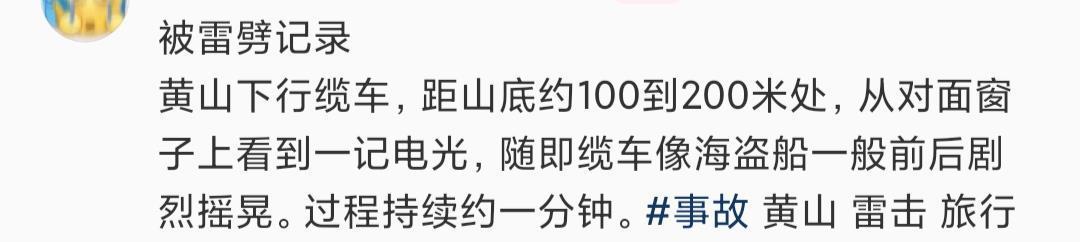 9月11日,有游覽安徽黃山的游客稱,其乘坐纜車下山時(shí)遭遇雷擊。12日,極目新聞?dòng)浾邚睦|車運(yùn)營方和黃山景區(qū)相關(guān)部門了解到,當(dāng)時(shí)纜車因天氣原因按照規(guī)范操作臨時(shí)停車,纜車吊廂沒被雷電擊中。